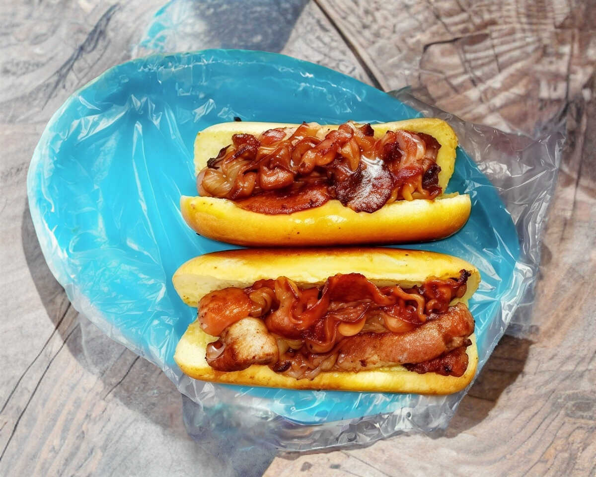 3 Salchichas de pavo acompañadas por rica Carne de Barbacoa