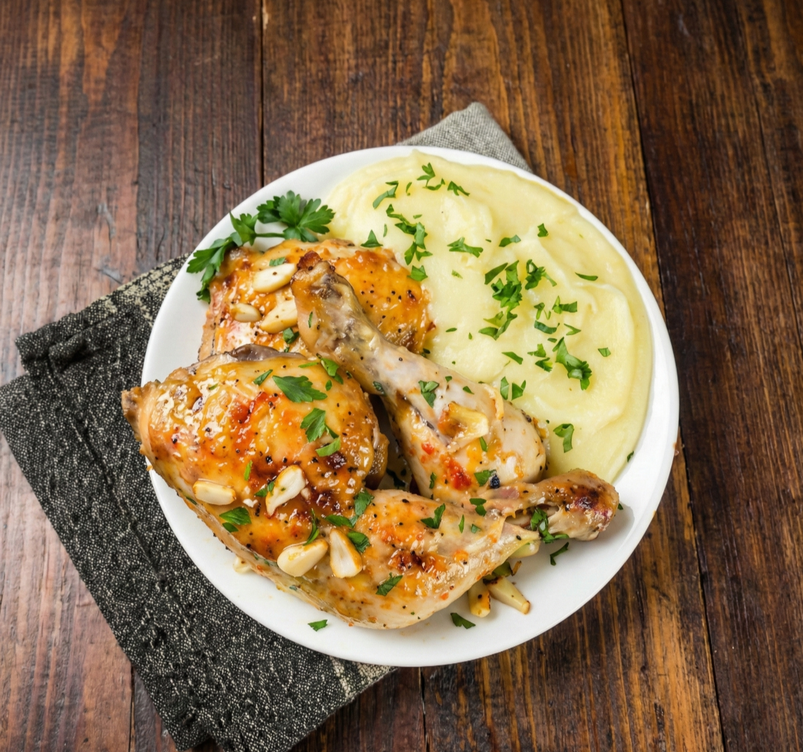 1.5 kg De pollo empanizado, 1 sopa, 1 ensalada, 1 puré, 1 refresco de 1.5 L, 8 bollos.