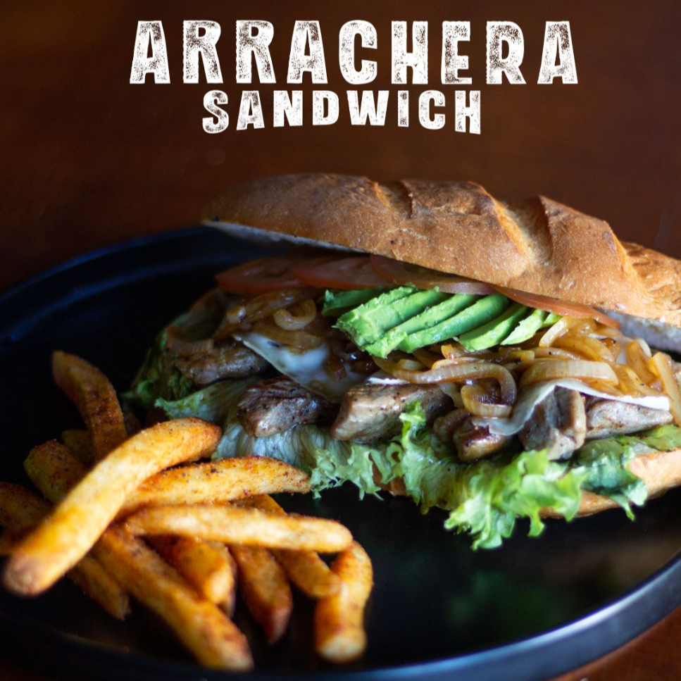 Deliciosa arrachera asada a la plancha, gratinada con queso Chihuahua blanco, cebolla asada, aguacate, lechuga y tomate. Incluye papas y aderezo.