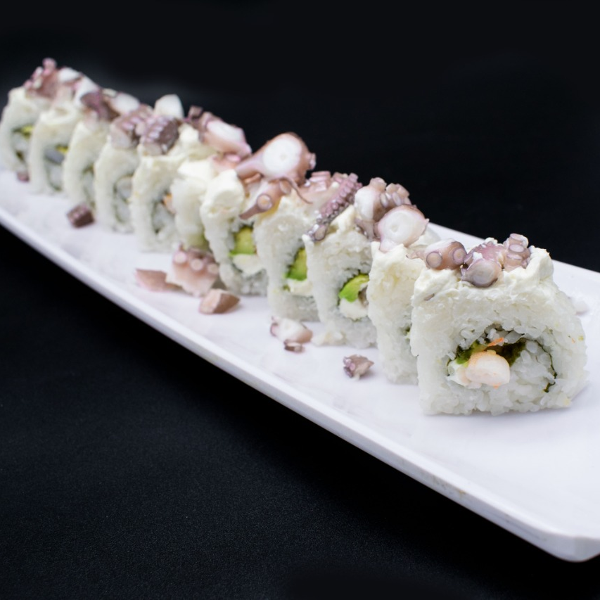 Camarón por dentro, por fuera philadelphia con trozos de pulpo y toping de tampico (todos nuestros rollos son preparados con base de aguacate y philadelphia) incluye salsa de soya.