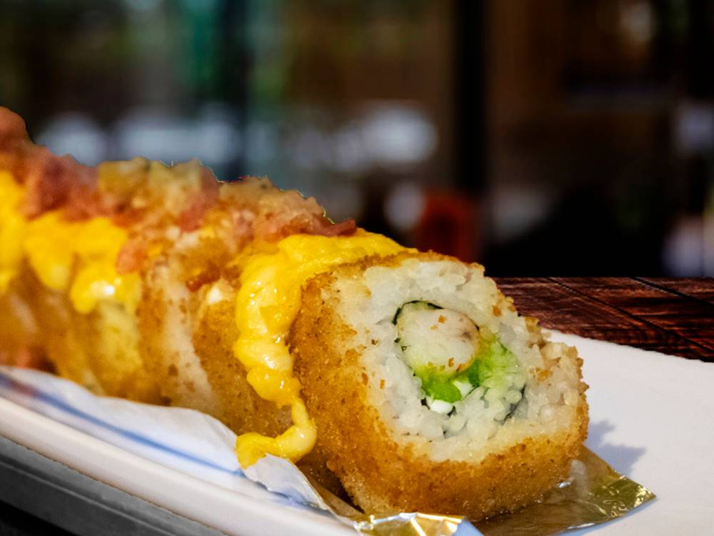 Rollo Empanizado - pulpo por dentro, envuelto en alga, decorado con aderezo chipotle, siracha, masago, trocitos de tocino y alga en fritura. (Todos nuestros rollos son preparados con base de aguacate y philadelphia) incluye salsa de soya.