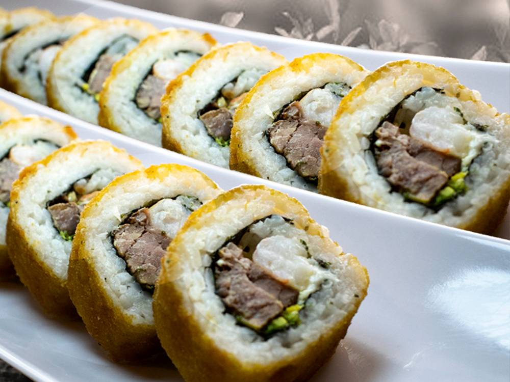 Empanizado camarón y arrachera por dentro con base de aguacate y philadelphia