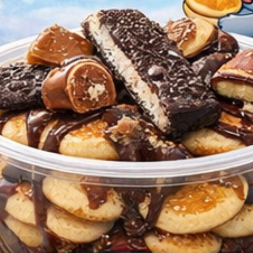 12 mini hotcakes bañados en hershey, oreo y chispas de chocolate
