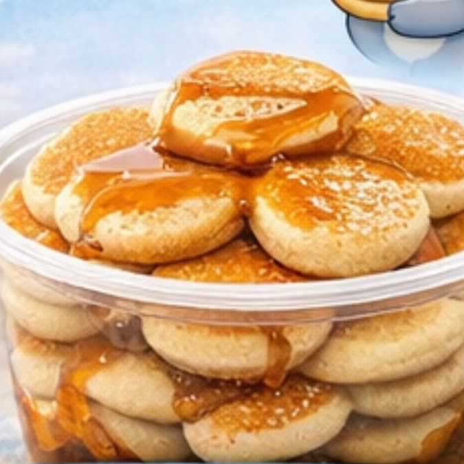12 mini hotcakes bañados en miel de maple y toque crujiente de nuez