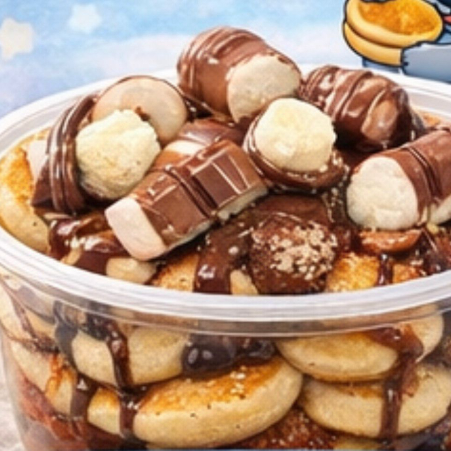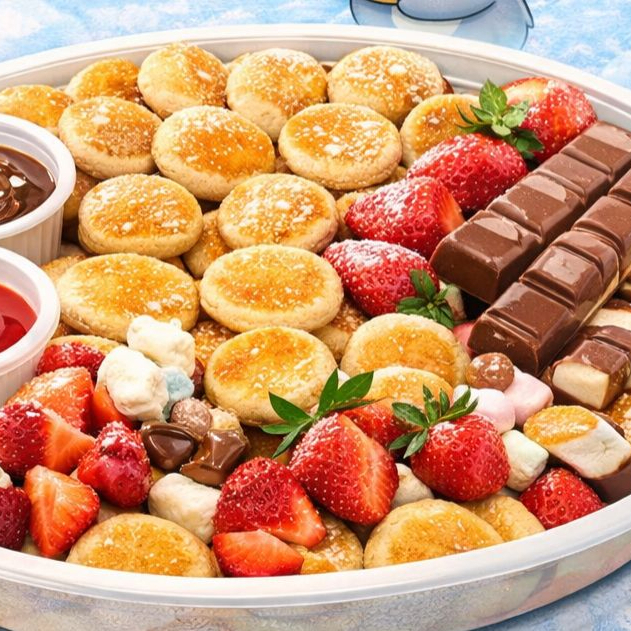 50 Mini Hotcakes + 2 toppings y 1 fruta o golosina. ¡Perfecta para compartir!