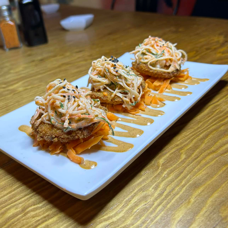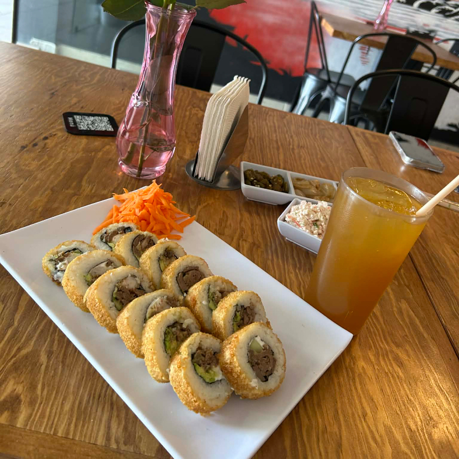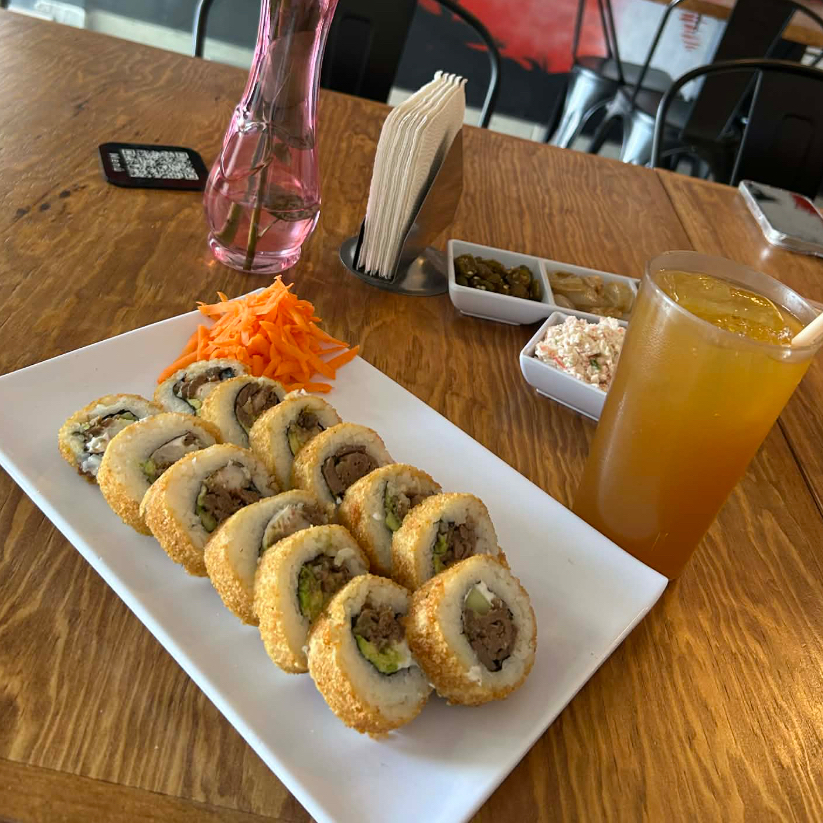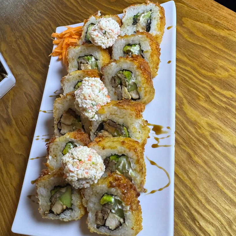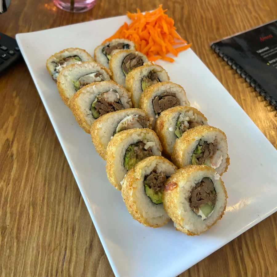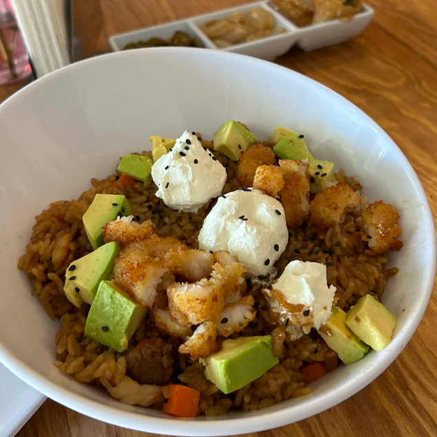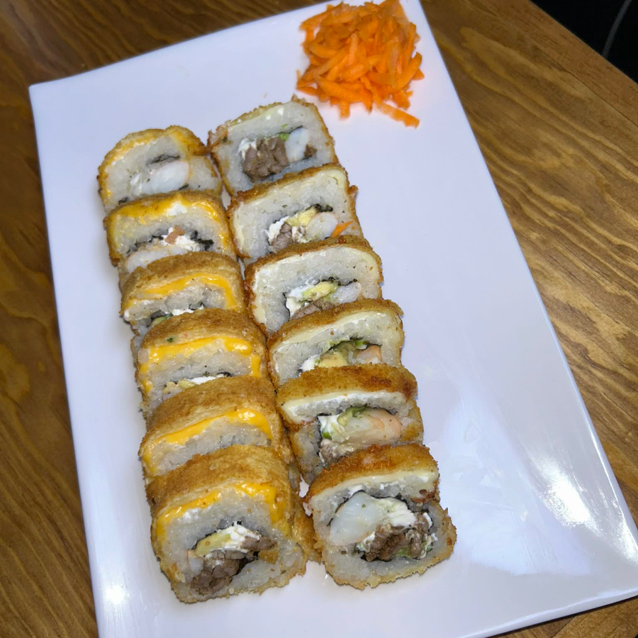 Arroz frito con res, camarón y calabaza zanahoria y cebollín. Coronado con Philadelphia, camarones empanizados y aguacate.