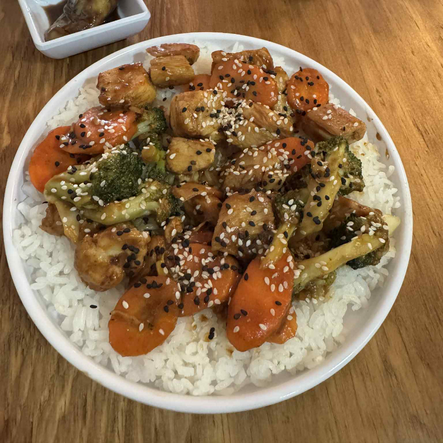 Arroz blanco, pollo en salsa teriyaki, zanahoria y brócoli
