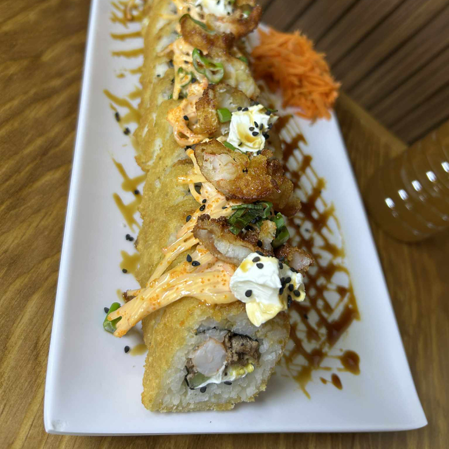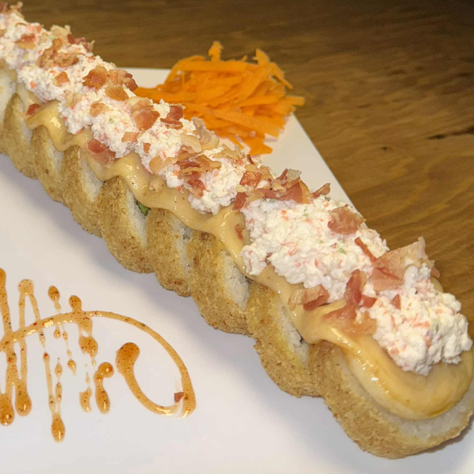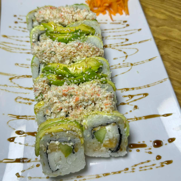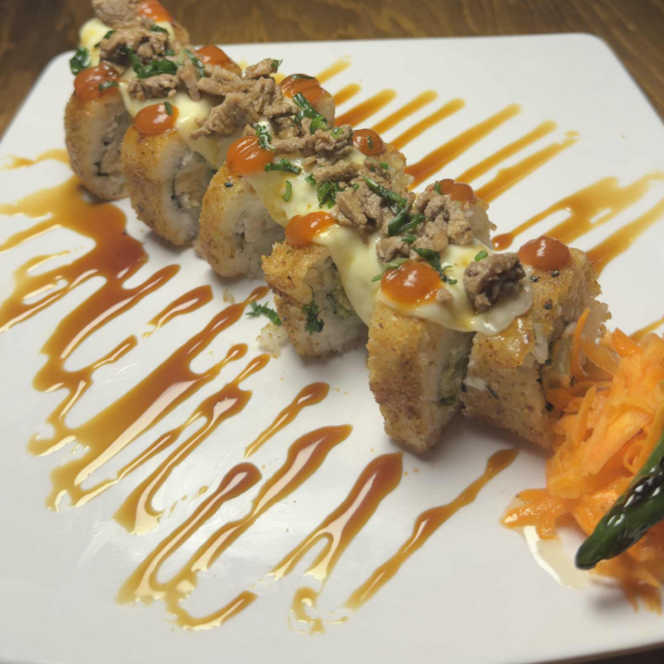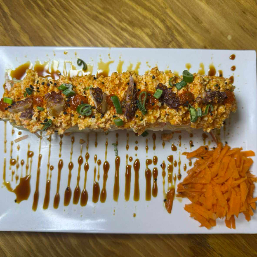 Rolló natural de cangrejo ,Philadelphia, pepino y aguacate , coronado con una cama te Tampico spicy, cebollín trozos de pulpo, siracha y anguila.