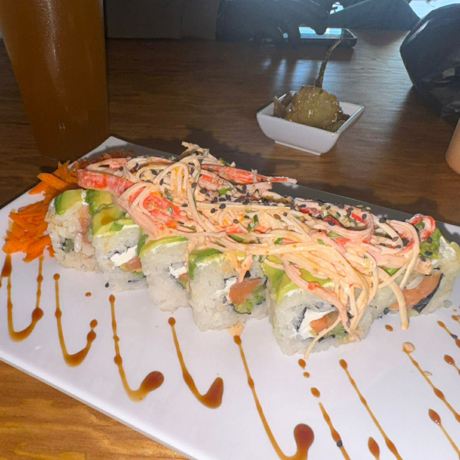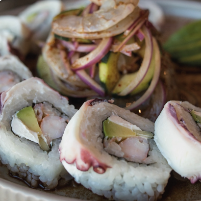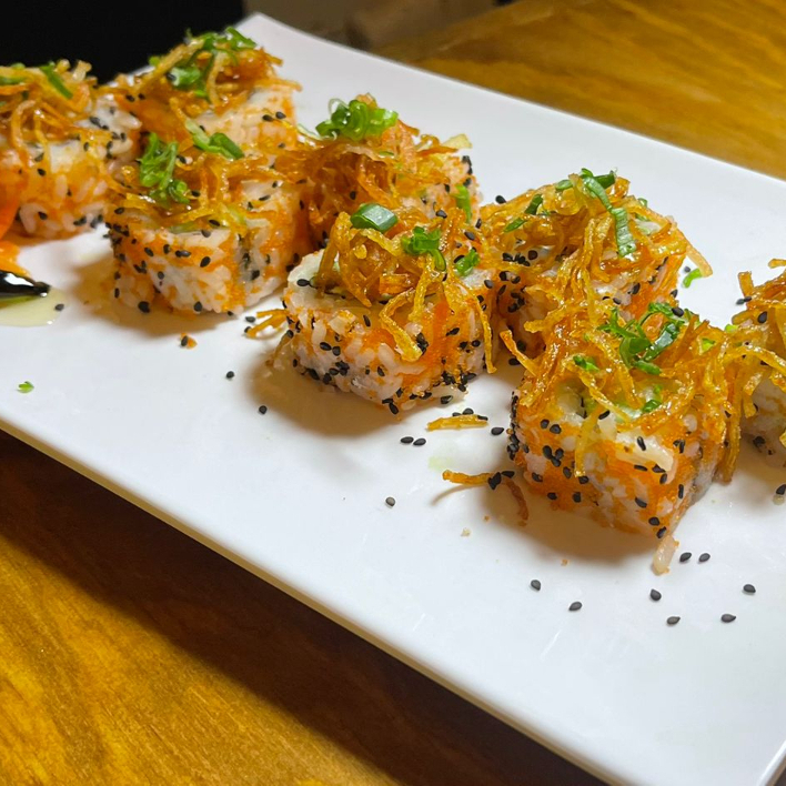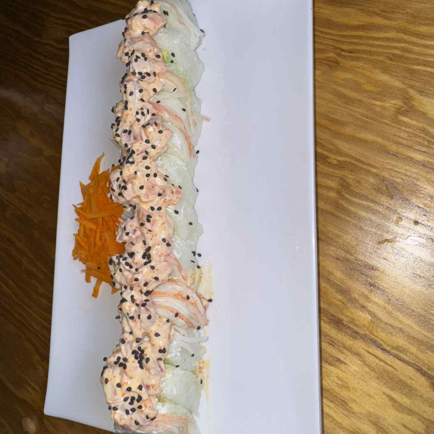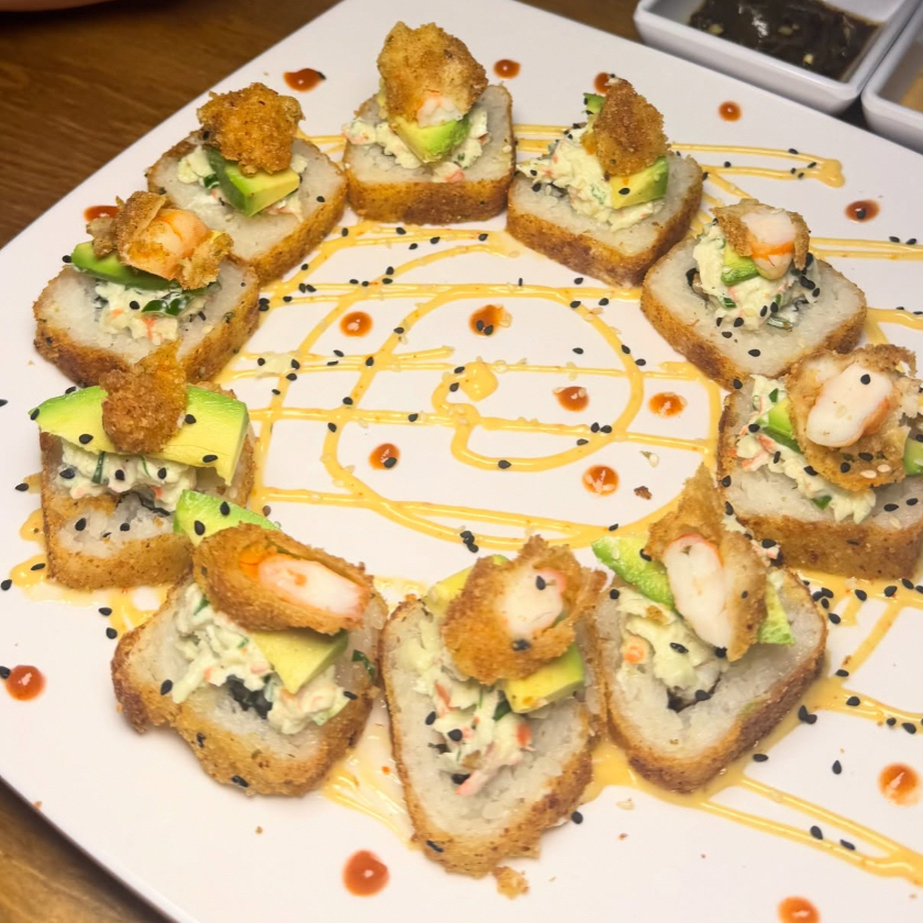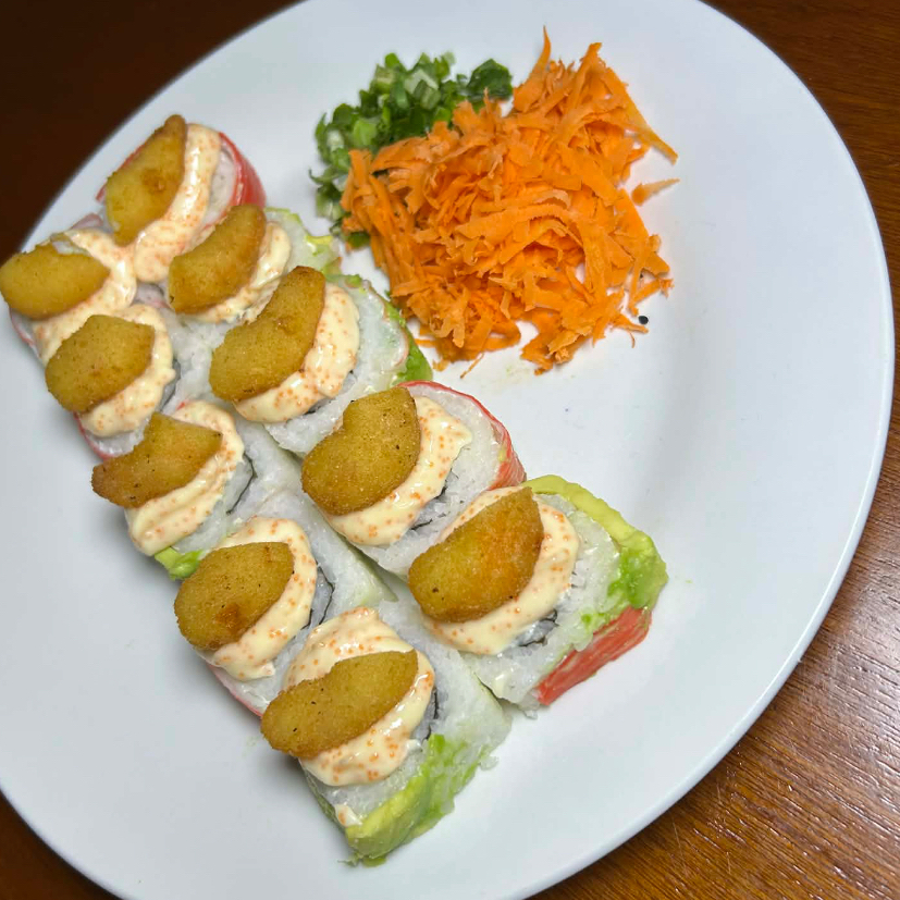 Rolló natural de cangrejo ,Philadelphia, pepino y aguacate , coronado con una cama te Tampico spicy, cebollín trozos de pulpo, siracha y anguila.
