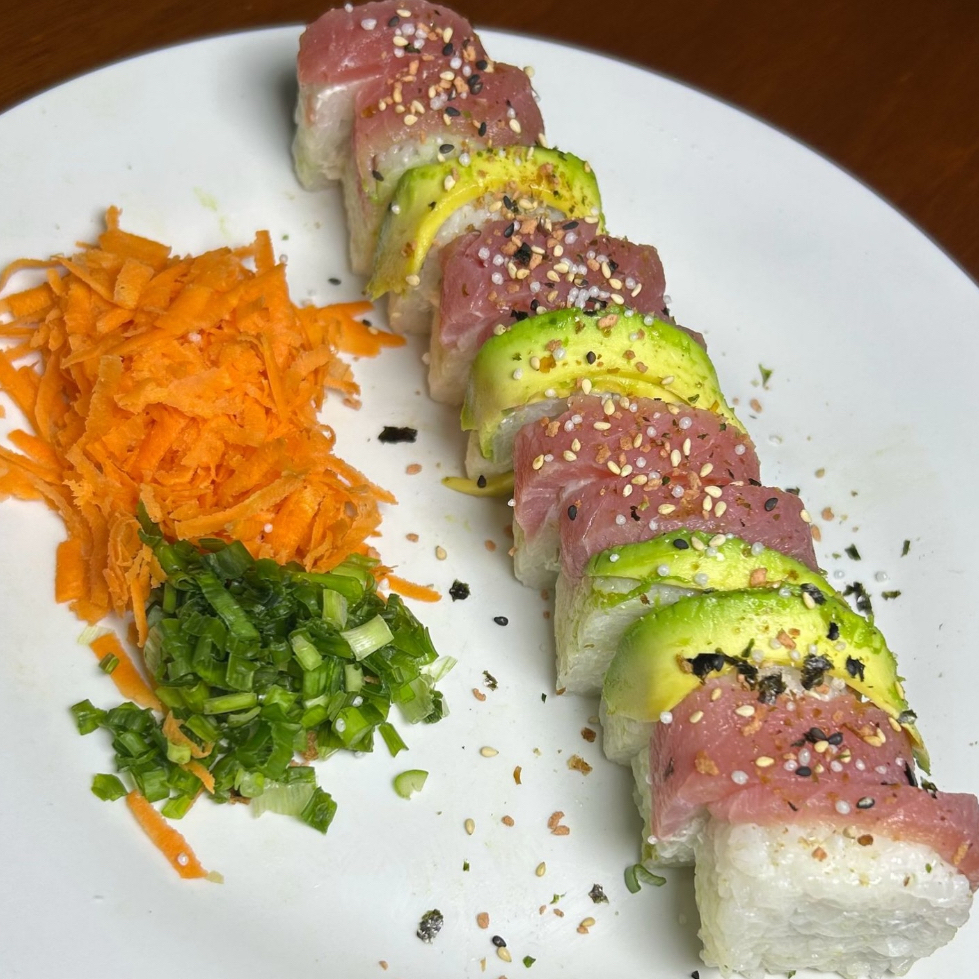 Rolló natural de pepino por dentro, topping: atún aguacate, Philadelphia y furikake.