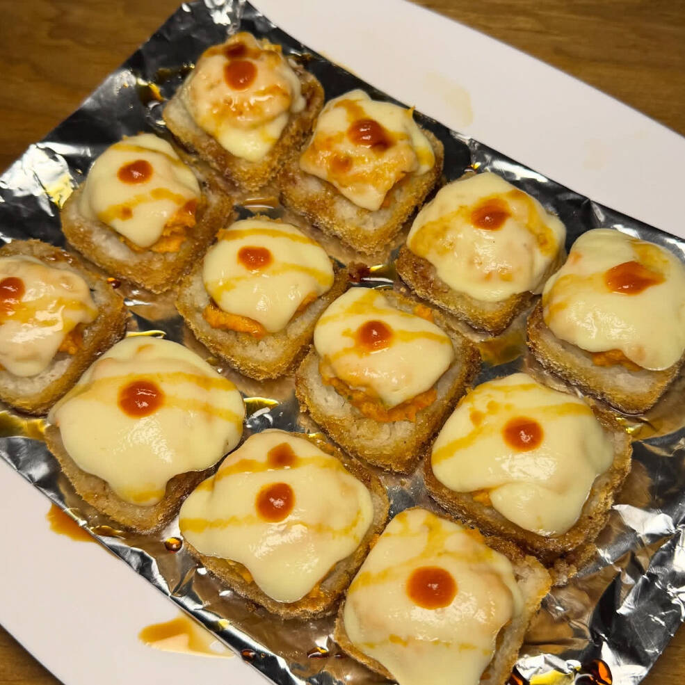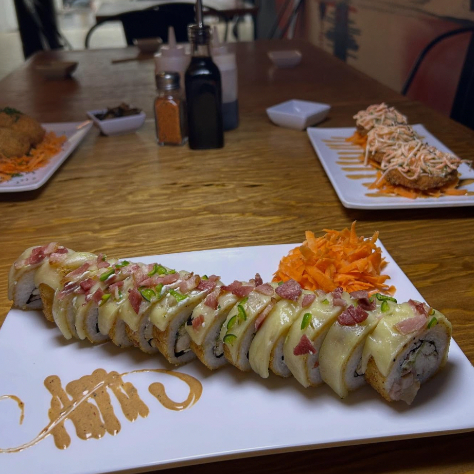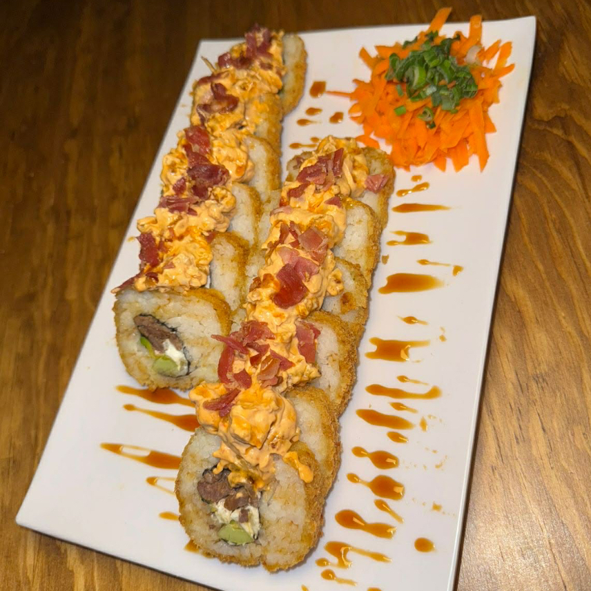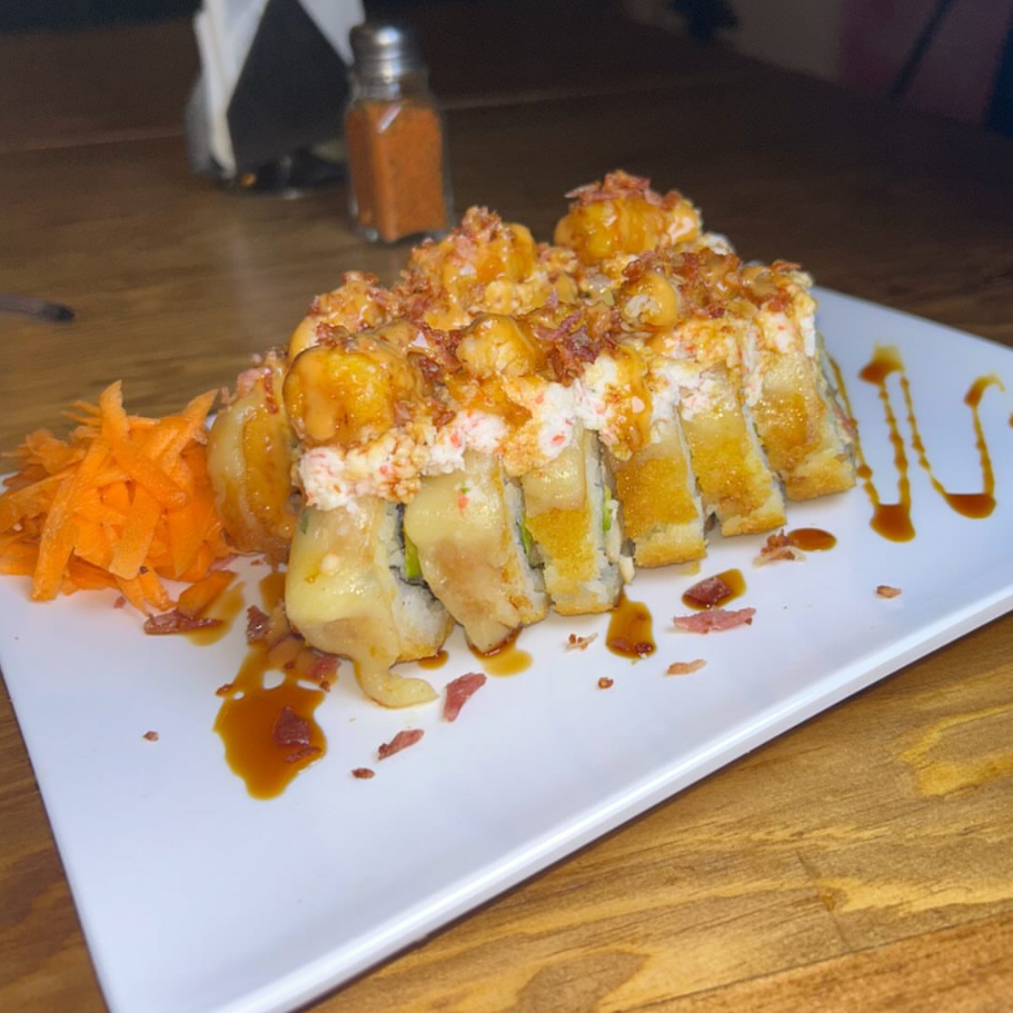 Pollo, aguacate y Philadelphia, gratinado de queso chihuahua, tocino, res y sirracha, bañado en salsa de anguila.