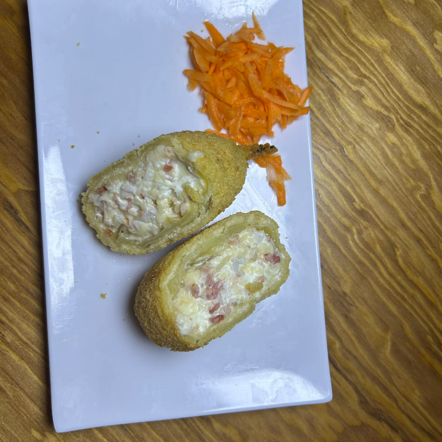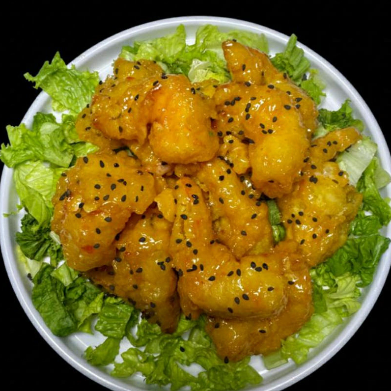 Camarones empanizados, con ensalada kani.
