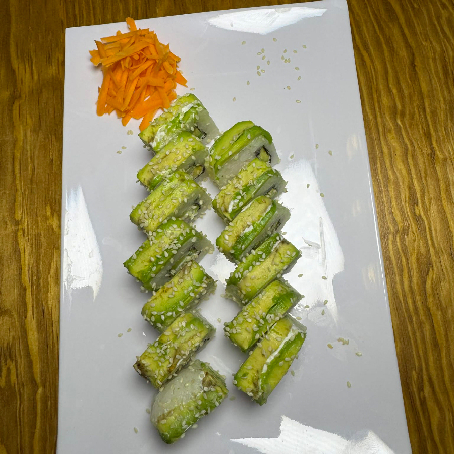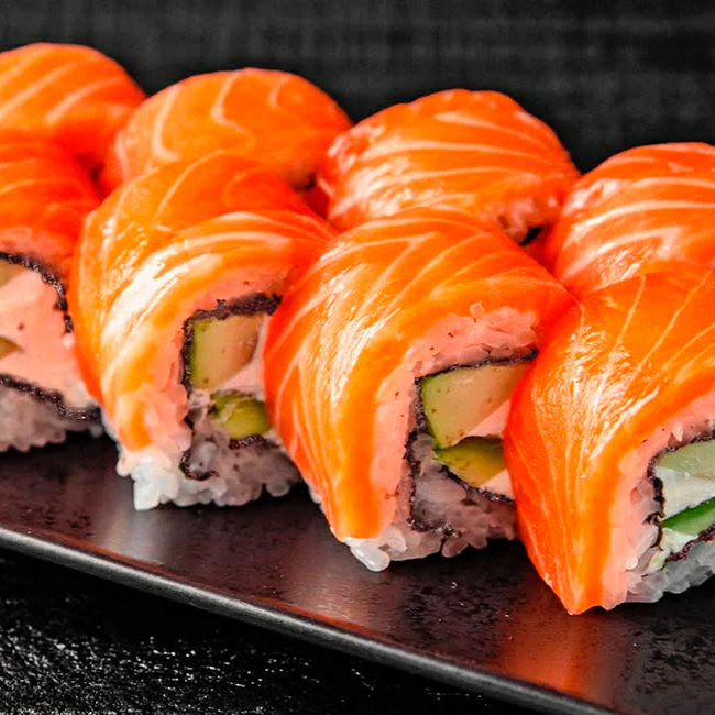 Pepino, aguacate y Philadelphia por dentro, forrado de salmón, con un toque de aderezo de cilantro.