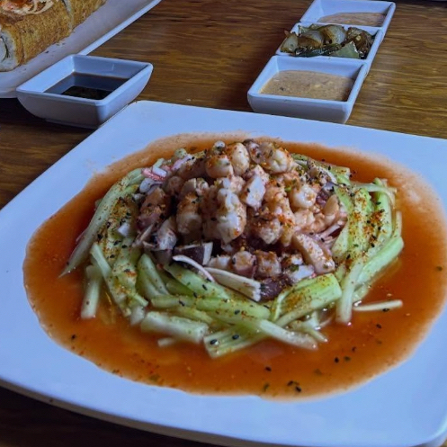 Ceviche de pepino, surimi, camarón y pulpo, con un toque de togarachi,