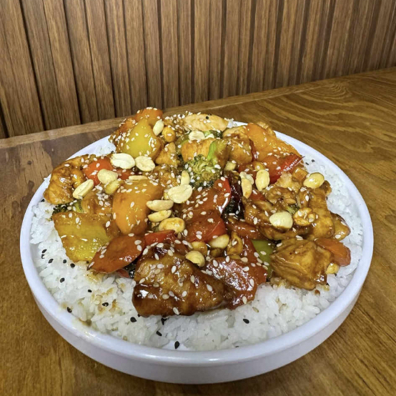 Pollo con vegetales, pimiento, brócoli, cebolla. Chile de árbol y cacahuate, acompañado de arroz blanco.