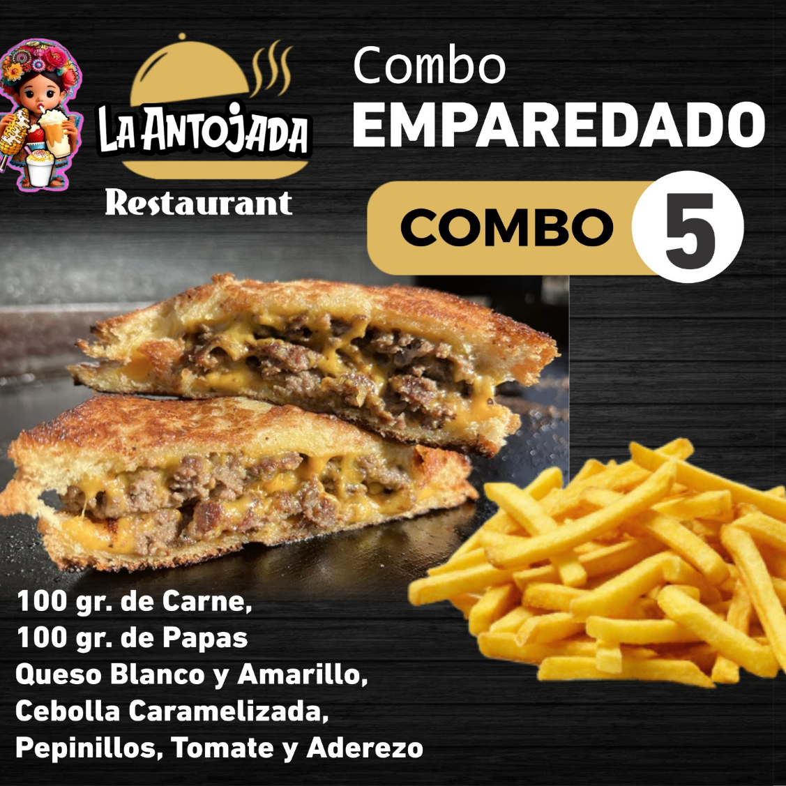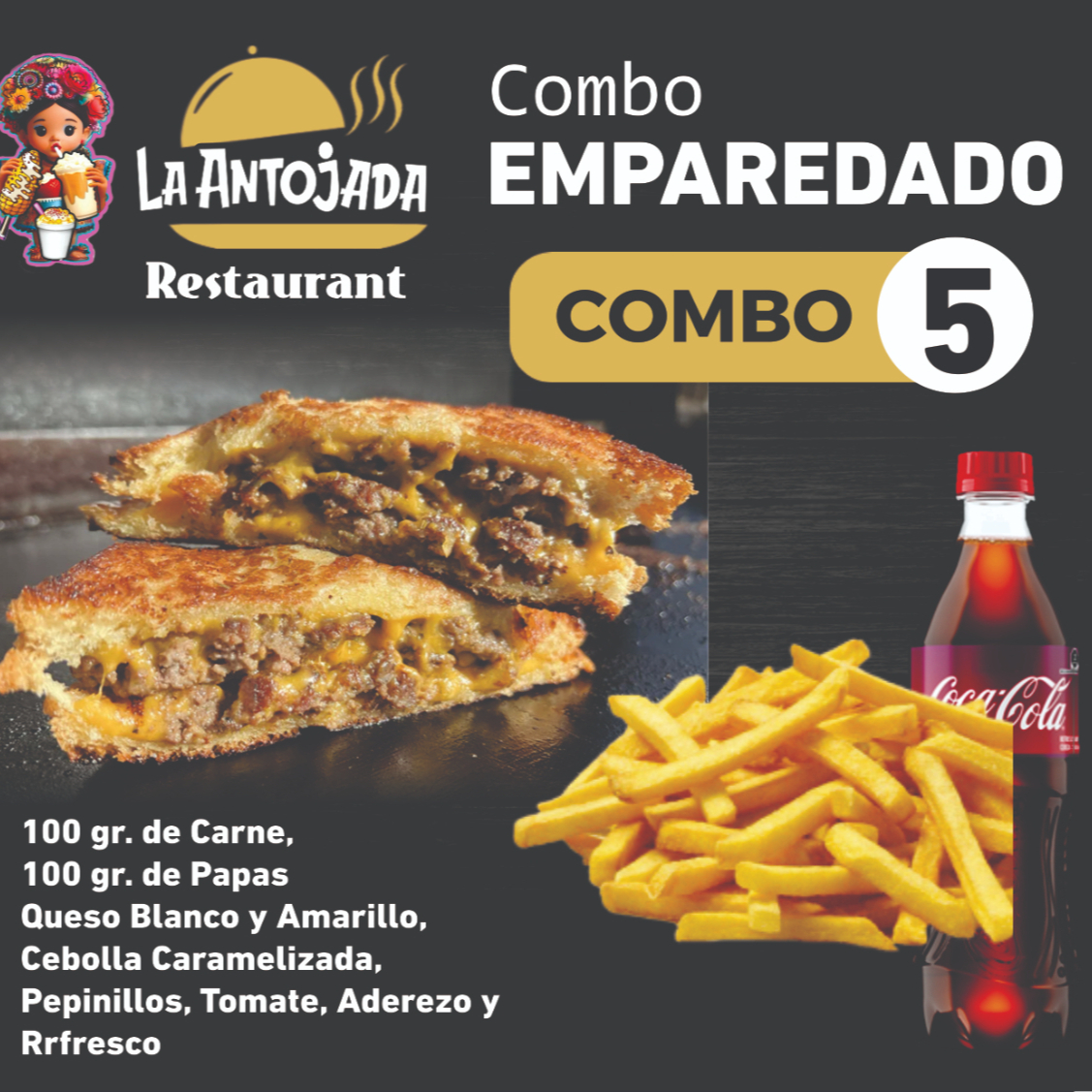 100 gr. de Carne, Queso Blanco y Amarillo, Cebolla Caramelizada, Pepinillos, Tomate, Aderezo, 100 gr de papas.