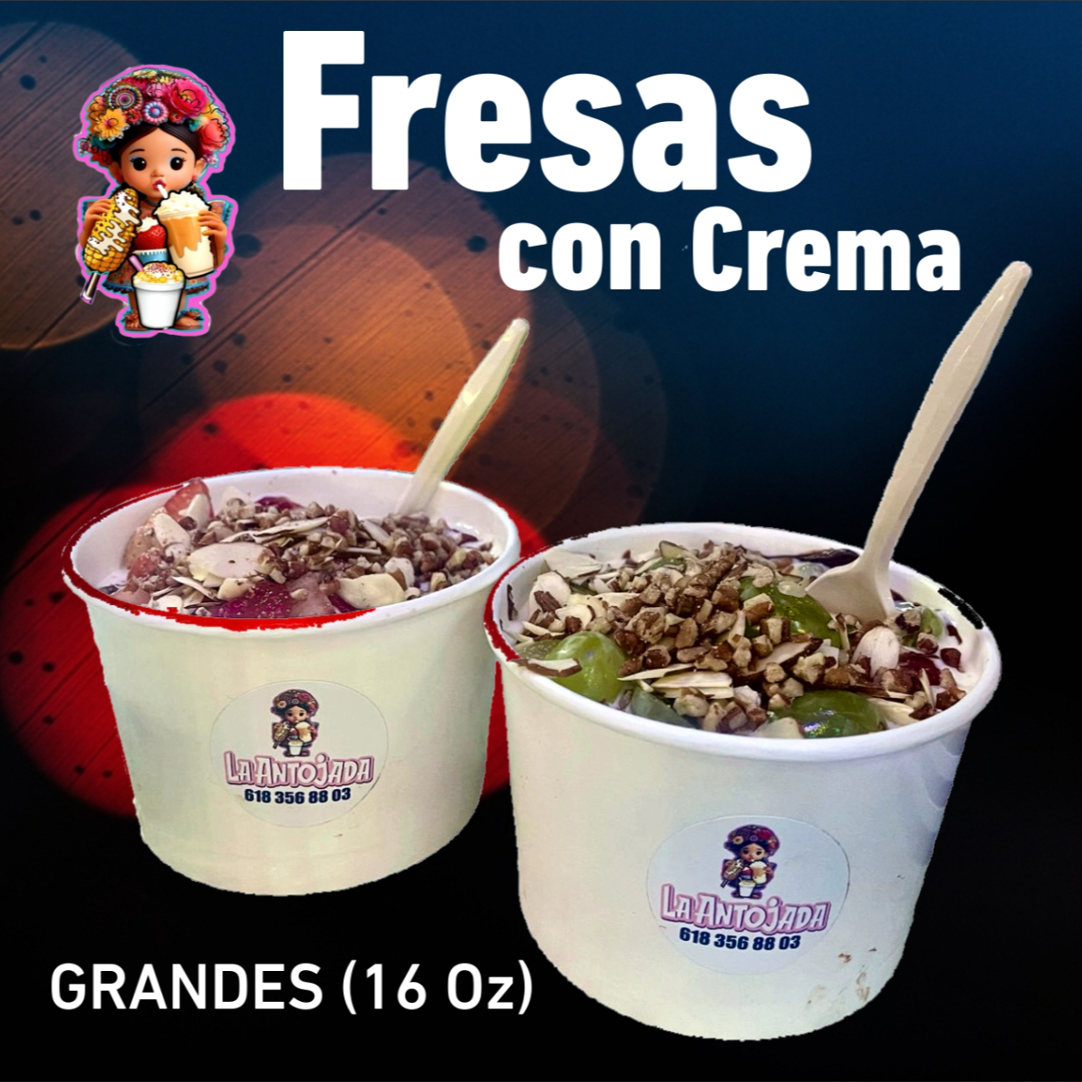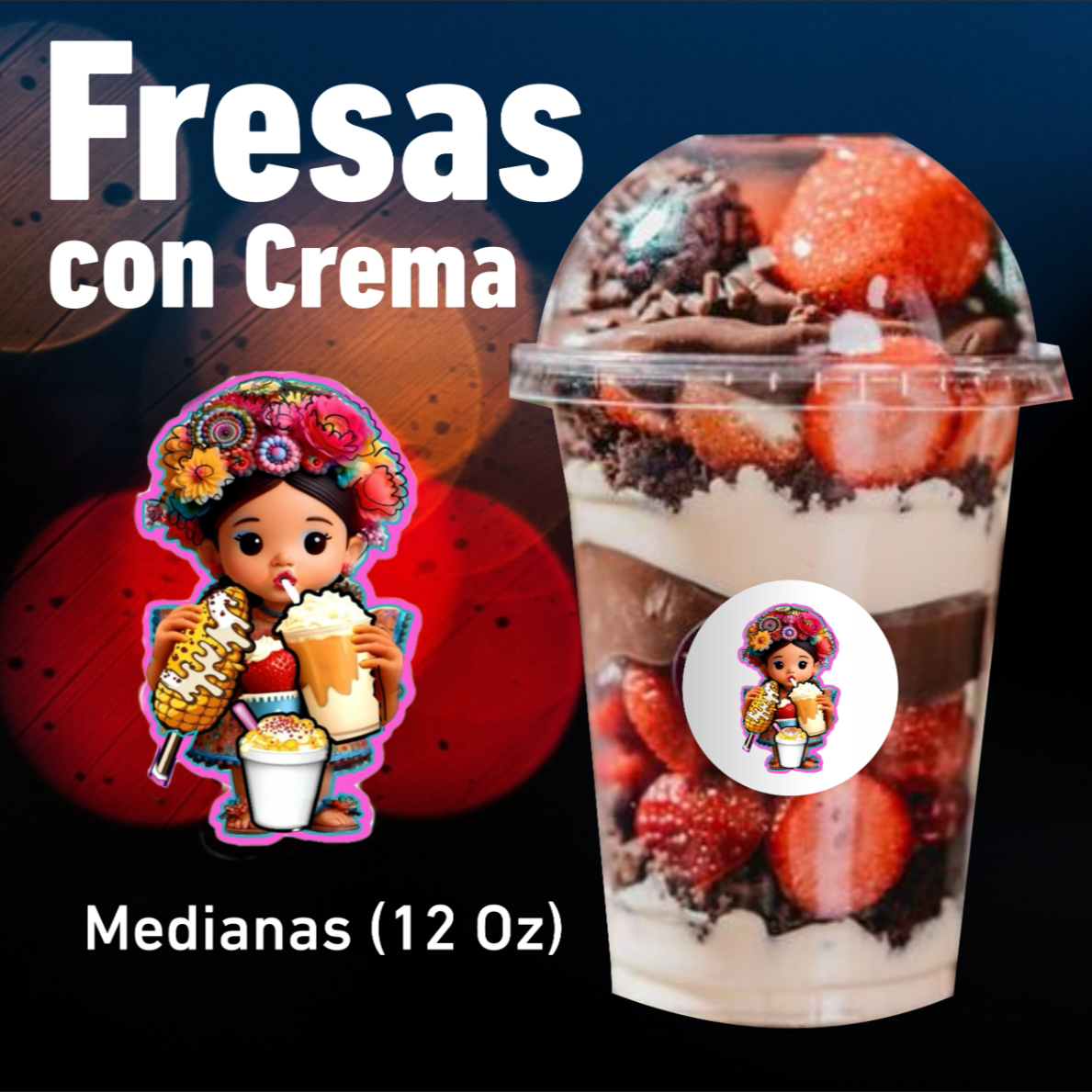Fresas frescas rebanadas y crema dulce de la casa con un toque de le lechera o jarabe de chocolate.