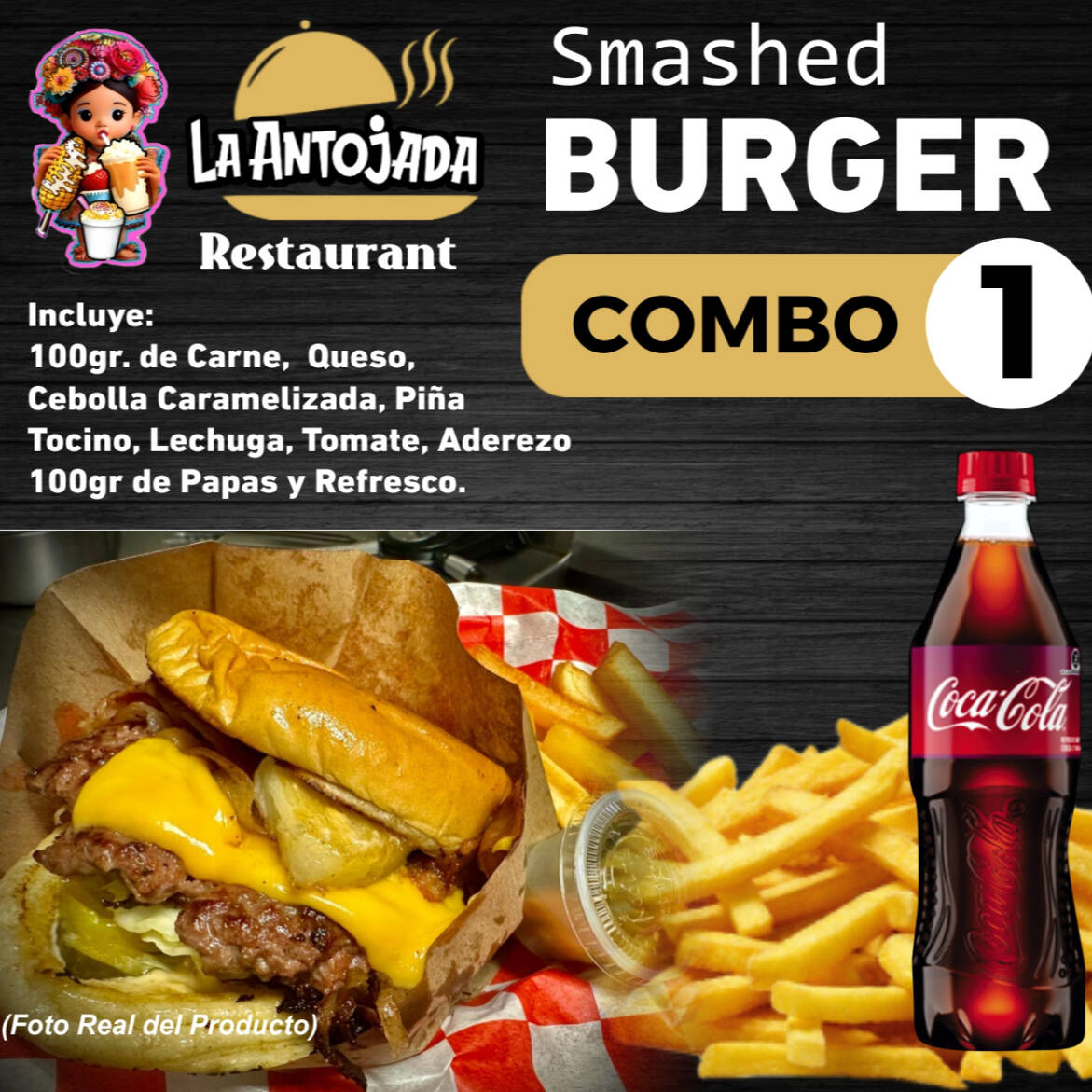 Incluye: 100gr. de Carne, Queso, Cebolla Caramelizada, Piña Tocino, Lechuga, Tomate, Aderezo 100gr de Papas y Agua fresca..