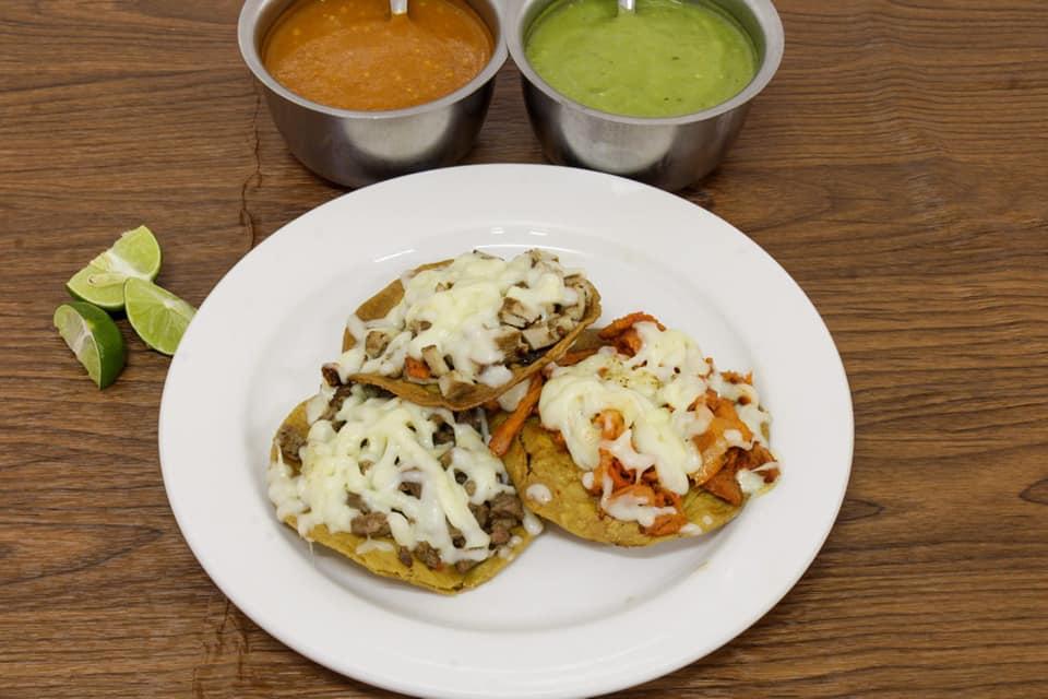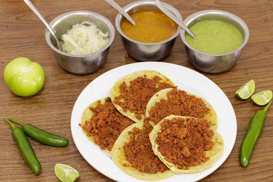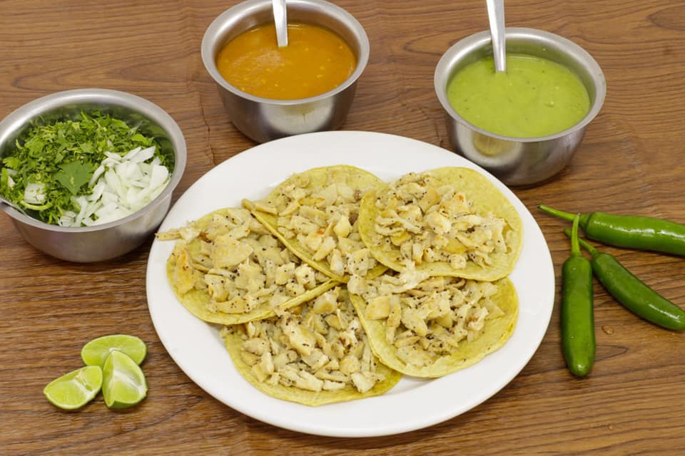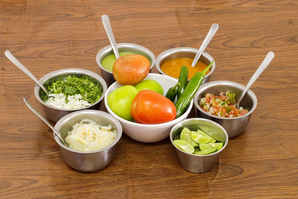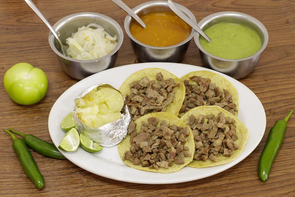 Combinación de carnes bistec, pastor, chuleta, chorizo, nopales, queso y cebollitas; 20 tortillas, salsas y verdura.