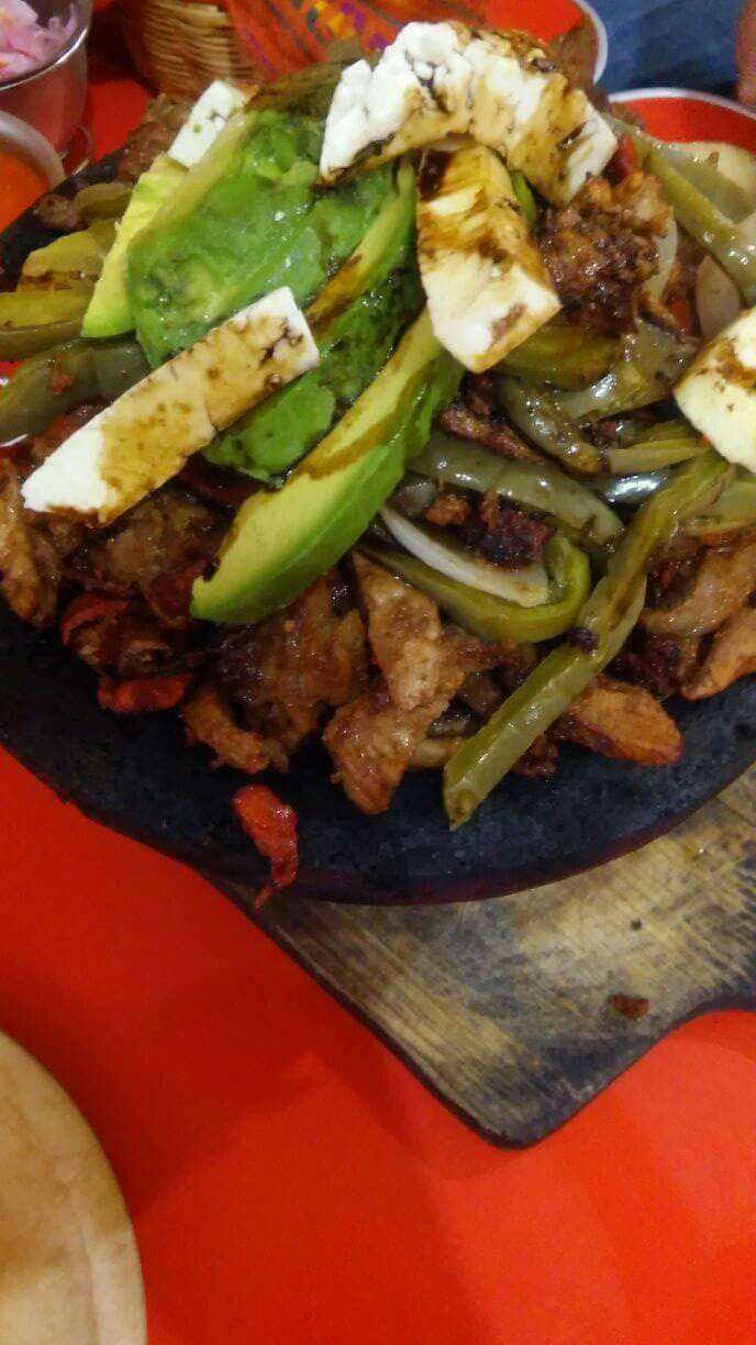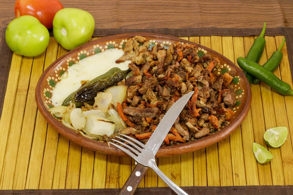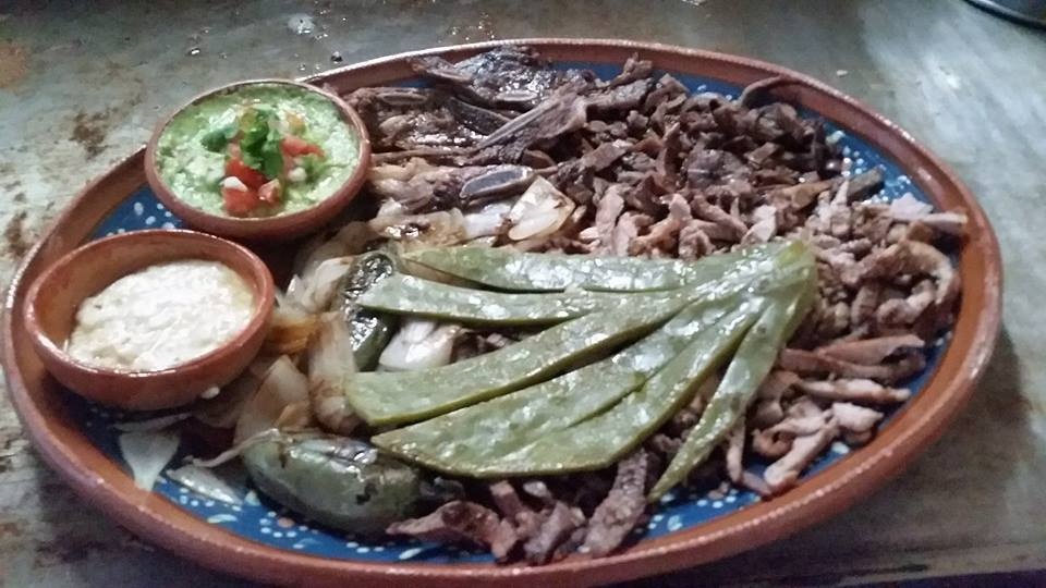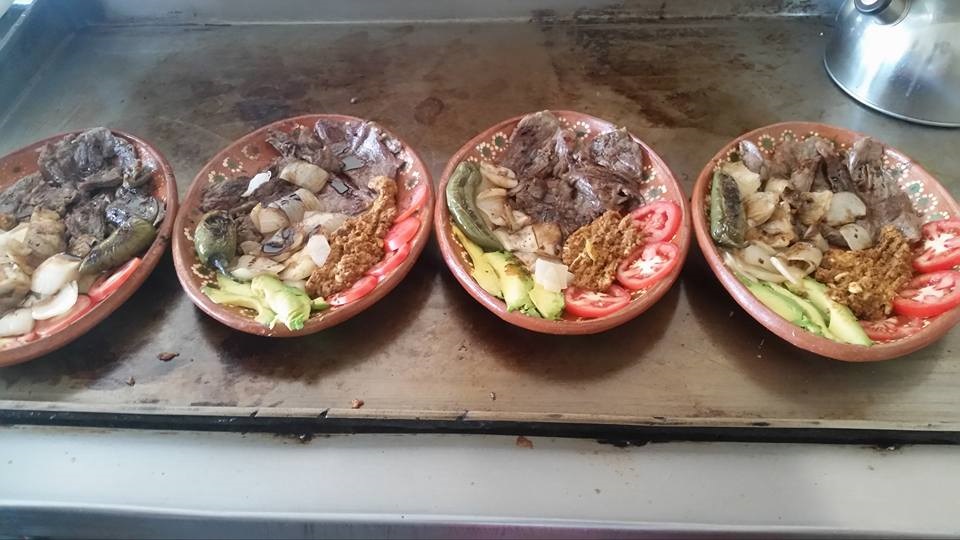 Combinación de carnes bistec, arrachera, costilla, chuleta, cebollitas, nopales, queso fundido, guacamole; 20 tortillas, salsas y verdura.