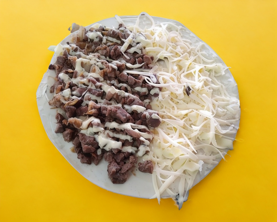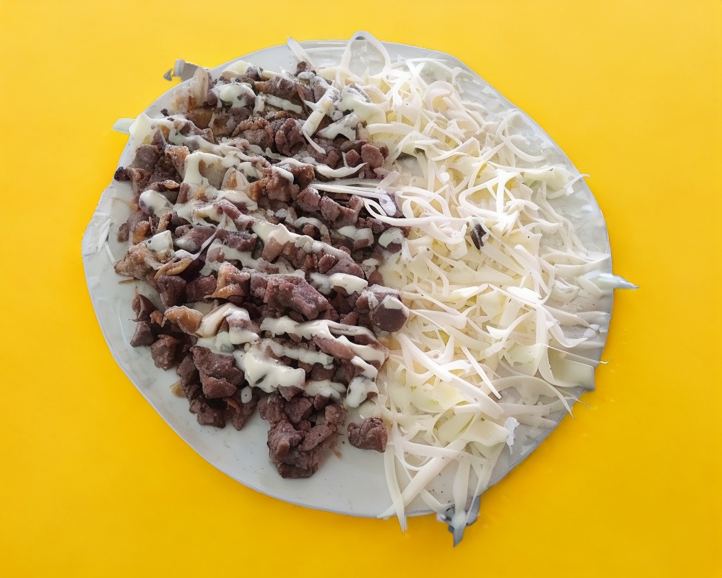 Carne asada cebolla asada queso blanco excelsior y aderezo de la casa