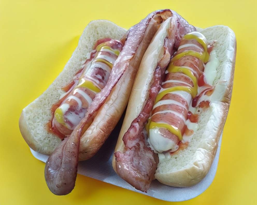 Pan salchicha y tocino con aderezos.
