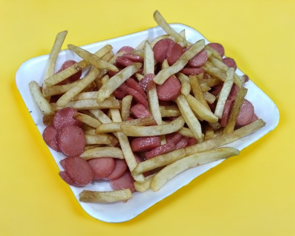200 g de papas fritas salchicha en rodajas catsup aderezo de casa