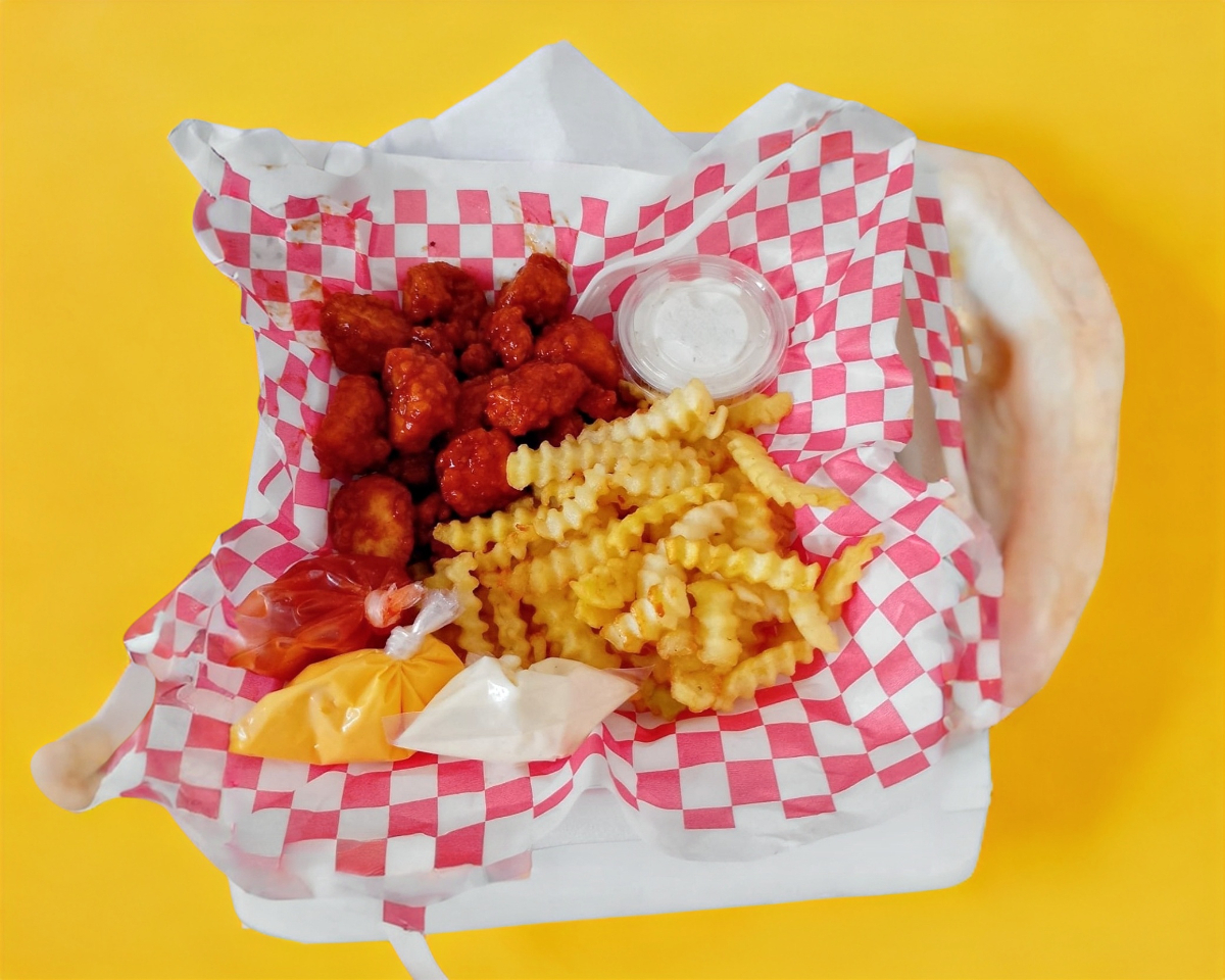250 g de boneles con sabor barbecue con 200 g de papas fritas acompañadas de un dip de aderezo ranch