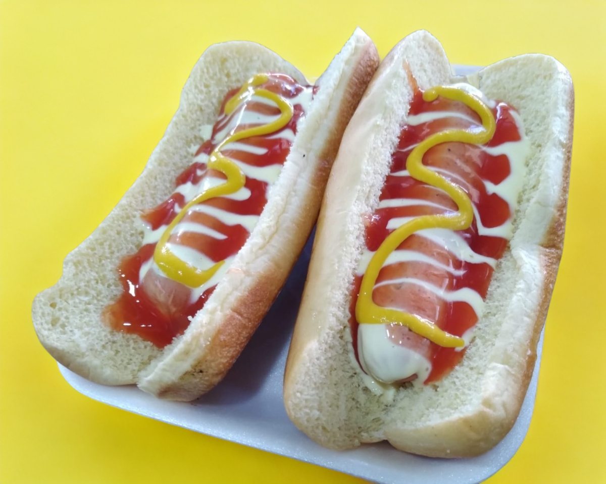 Pan y salchicha con aderezos.