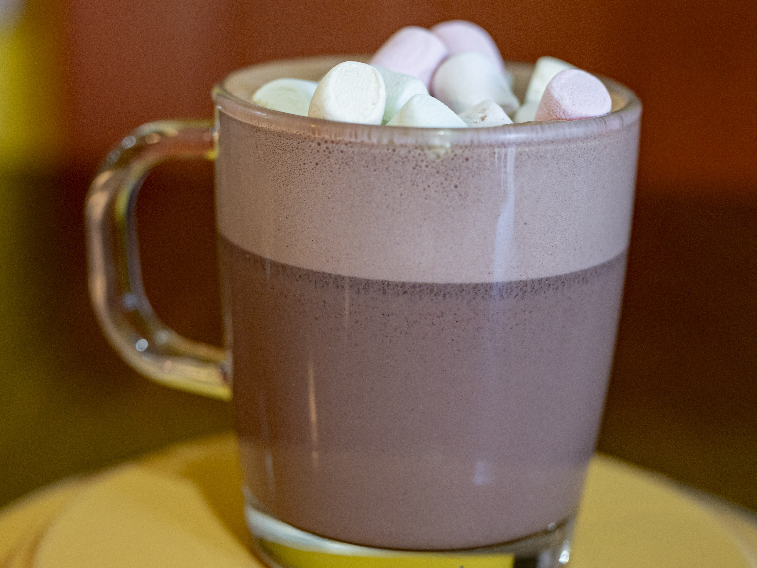 Chocolate caliente 12oz. Leche entera espumada, mezcla cocoa, vainilla y canela endulzado con piloncillo. contiene malvaviscos
