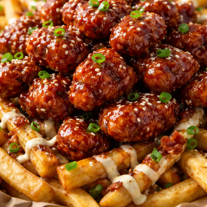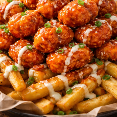 2 ordenes de papas fritas como base y una orden de boneless BBQ encima acompañados de aderezo ranch