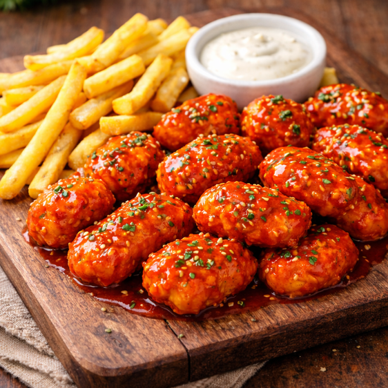 200 gramos de boneless bañados en salsa BBQ acompañados de una orden de papas fritas y aderezo ranch