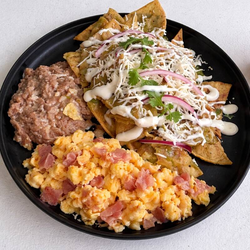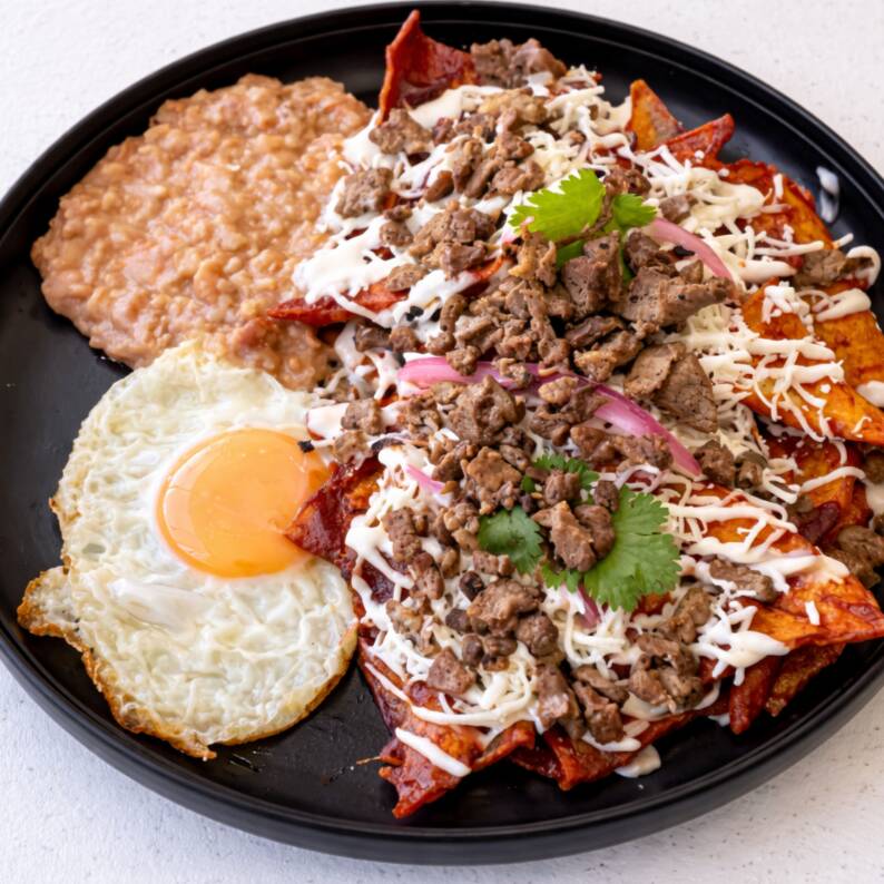 Porción de chilaquiles con su salsa a elegir, queso, crema, frijoles, huevo al gusto y porción de proteína (pollo o bistec).