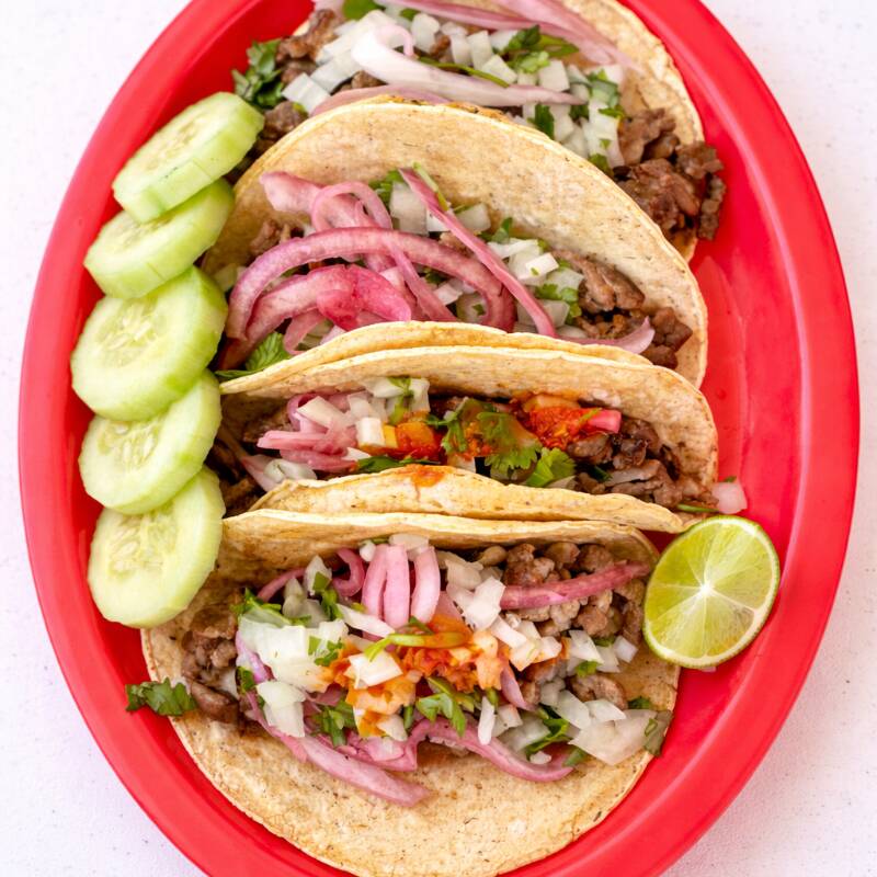 Tortilla de maíz normal, acompañado con su cebolla asada, cebolla con cilantro, cebolla morada curtida, pepinos, limones y salsa roja de árbol.
