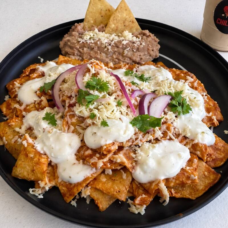 Porción de chilaquiles con su salsa a elegir, queso, crema y frijoles de la casa.