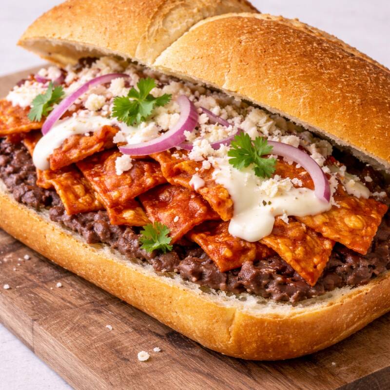 Pan suave y crujiente embarrado con frijoles, mayonesa, porción de chilaquiles con salsa a elegir, queso y crema.