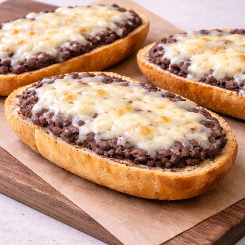 Pan suave y crujiente embarrado con mantequilla, frijoles y queso acompañado de una salsa roja de árbol.