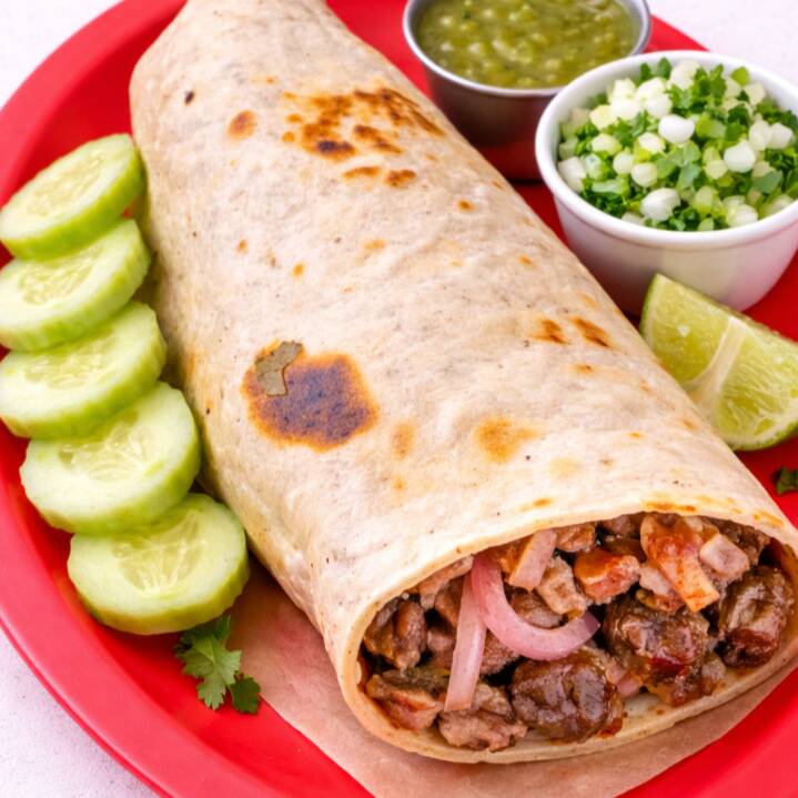 Tortilla de harina, con queso y carne acompañado con su cebolla asada, ceboolla con cilantro, cebolla morada curtida, pepinos, limones y salsa roja de árbol.