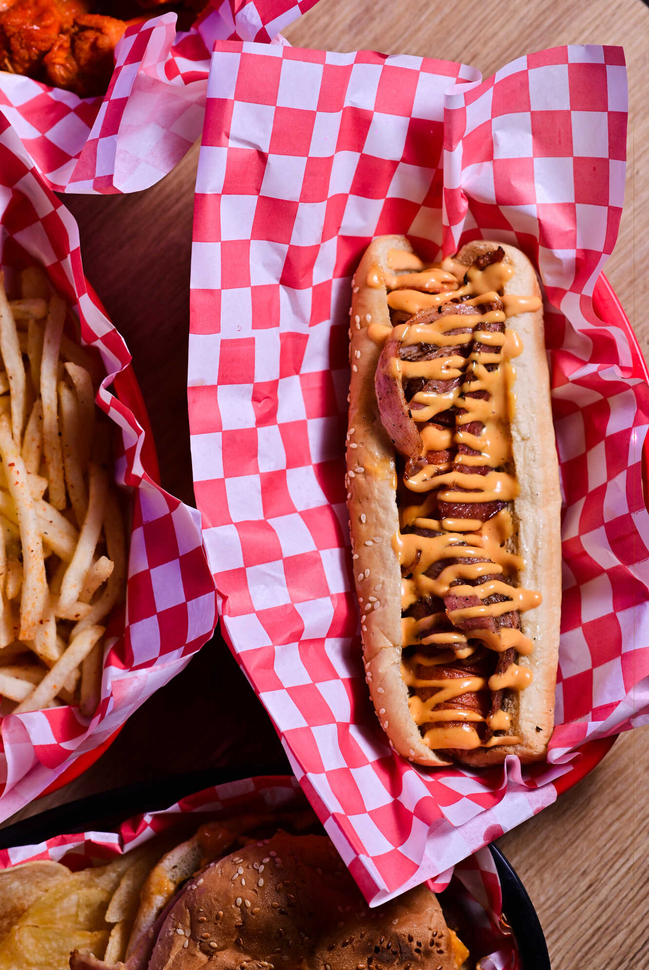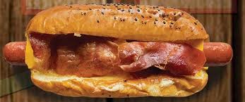 Pan con salchicha jumbo de 100 g, envuelto en tocino con aderezos.