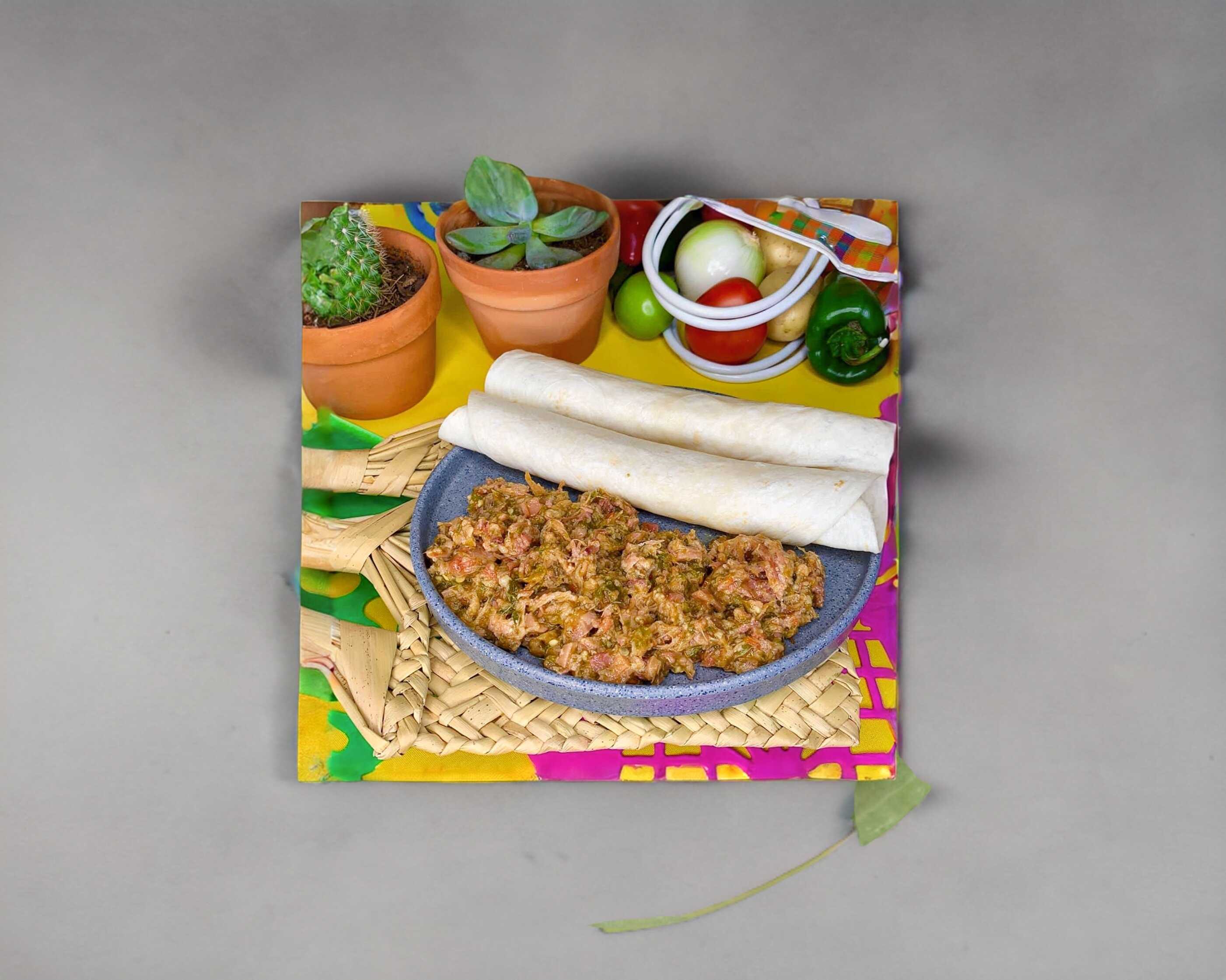 Tortilla de harina con queso menonita y chicharrón prensado artesanal en salsa verde de la casa.