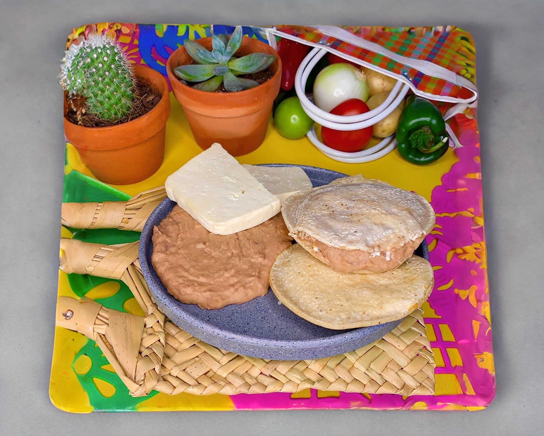 Delicioso pan tostado con mantequilla, frijolitos refritos, queso gratinado, pico de gallo y hasta dos de los guisos que ya conoces, a elegir.