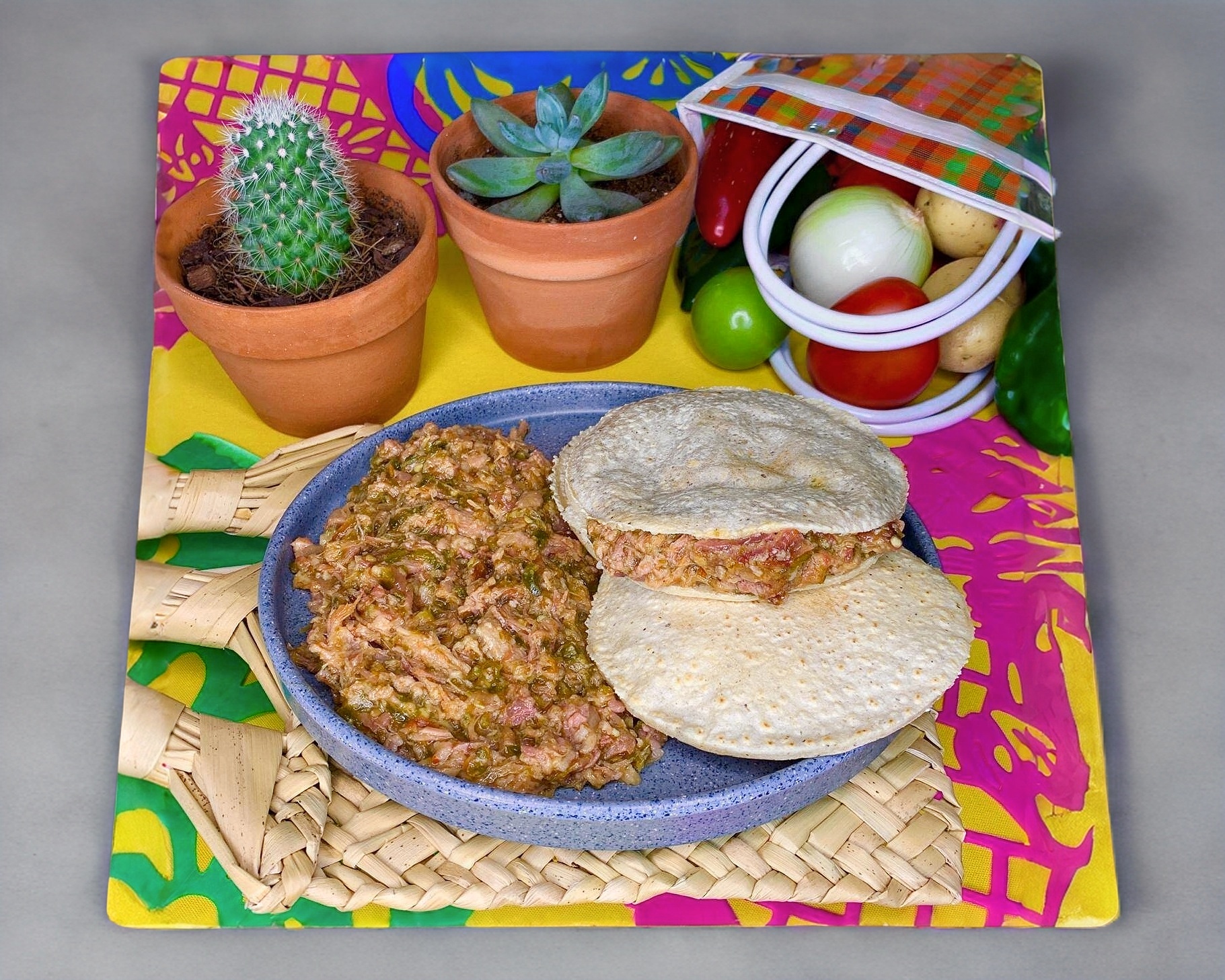 Tortilla de harina con queso menonita y carne de puerco en cubitos en salsa verde y rajas de chile poblano.