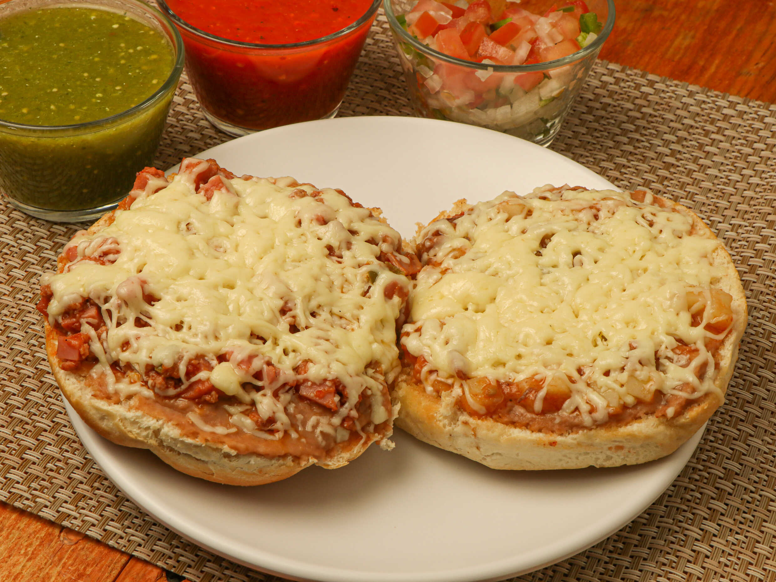 Delicioso pan tostado con mantequilla, abundantes frijolitos refritos, queso gratinado y pico de gallo.