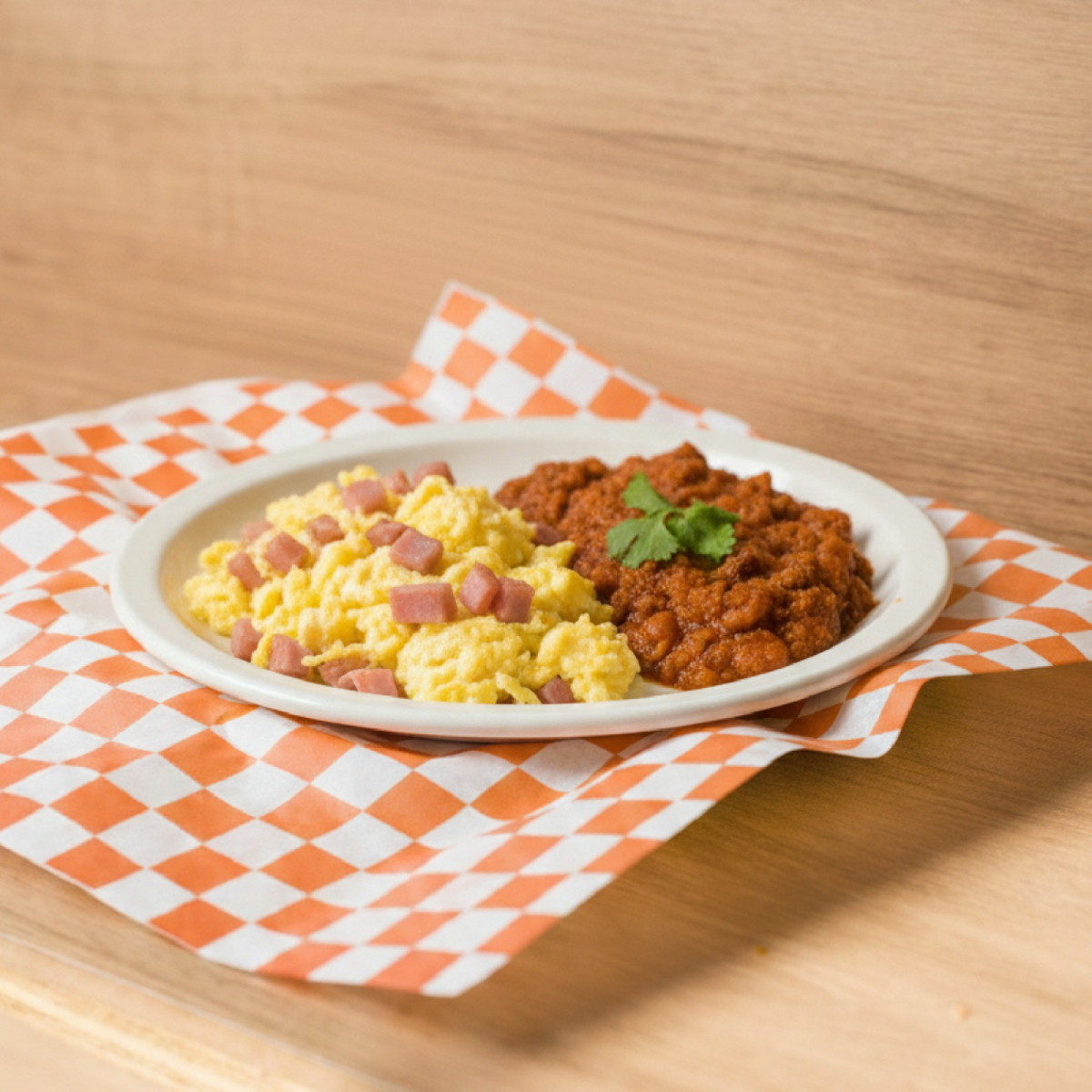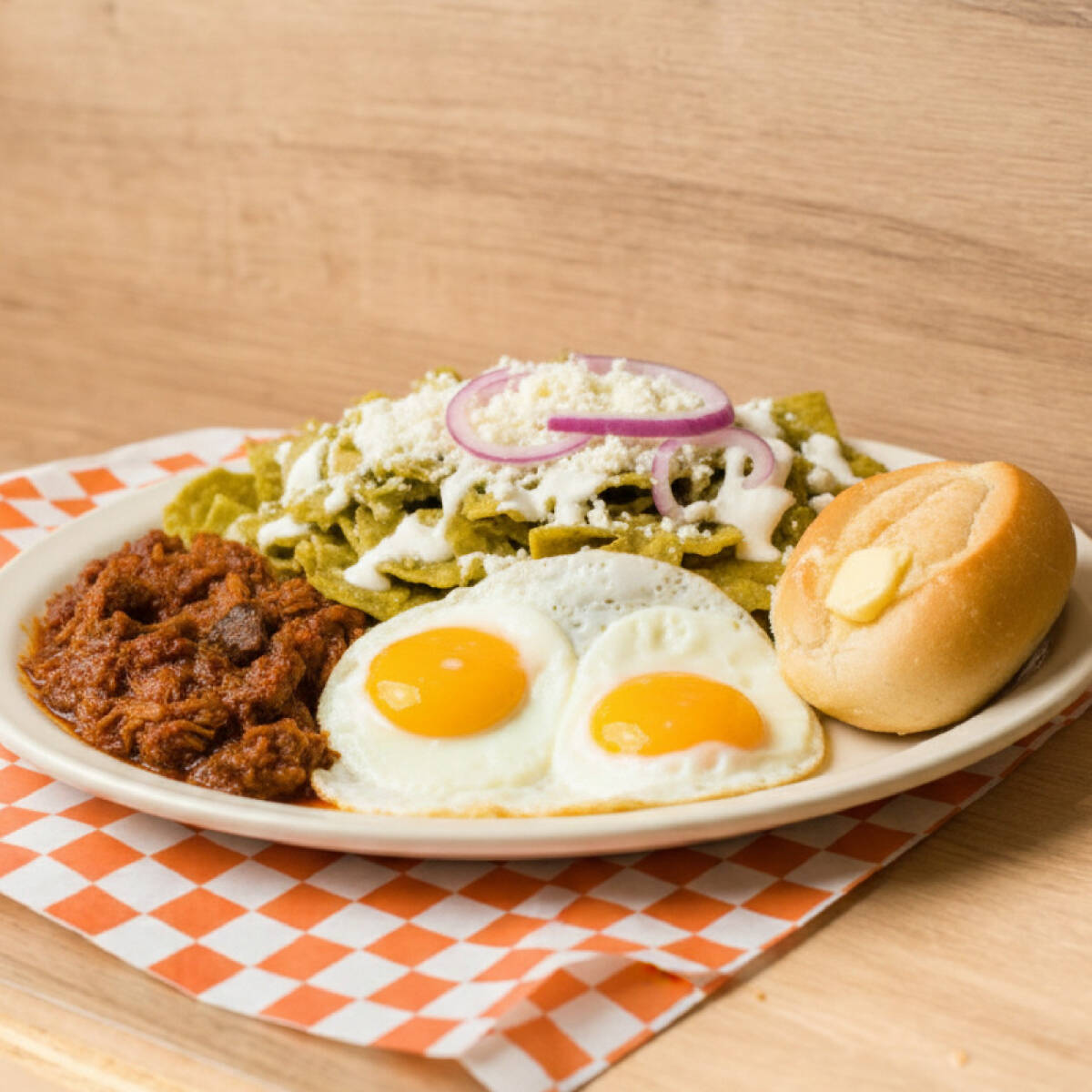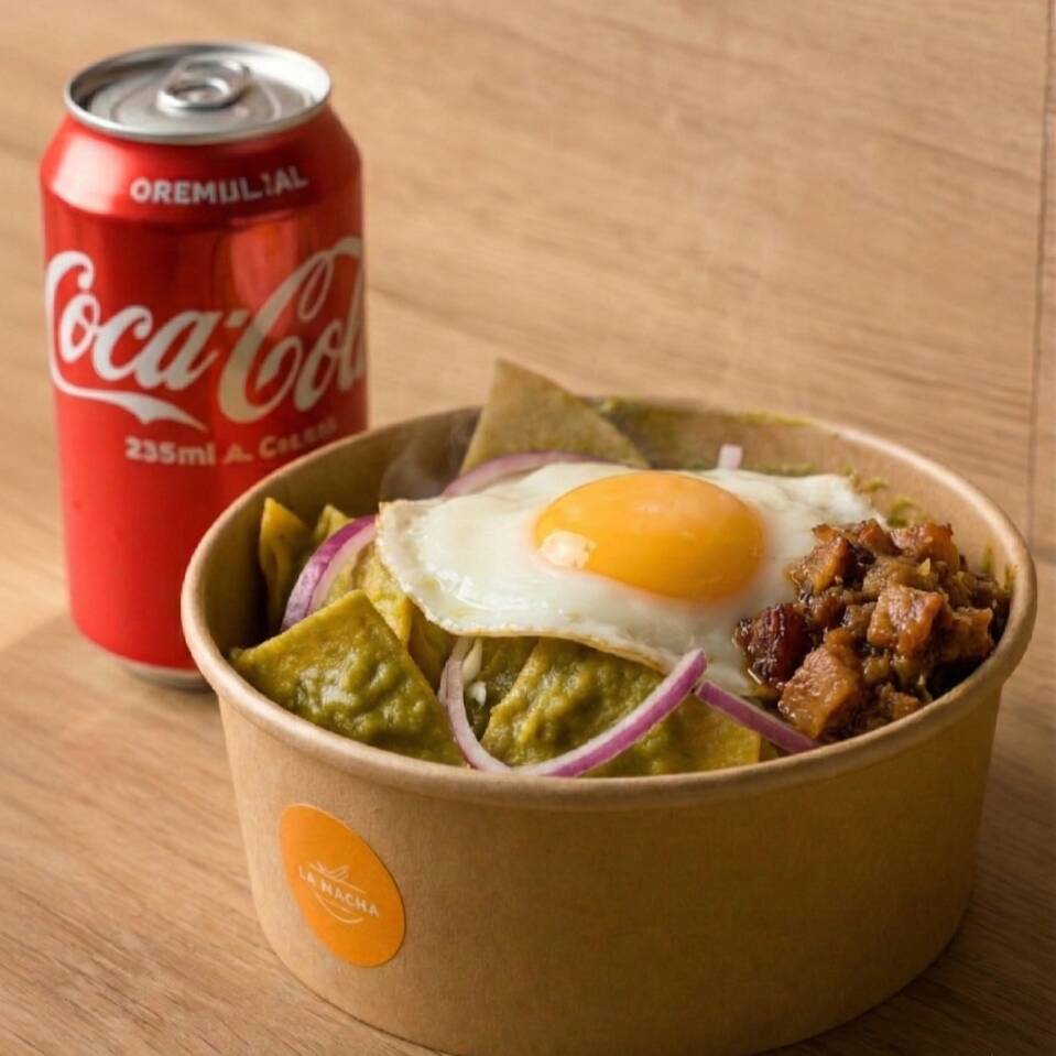 La combinación definitiva: Chilaquiles en tu salsa preferida, huevo estrellado tierno y una generosa porción de guiso casero encima. Lo servimos con frijolitos calientes para cerrar con broche de oro. Sabor y energía en un solo plato.