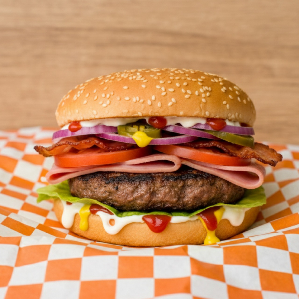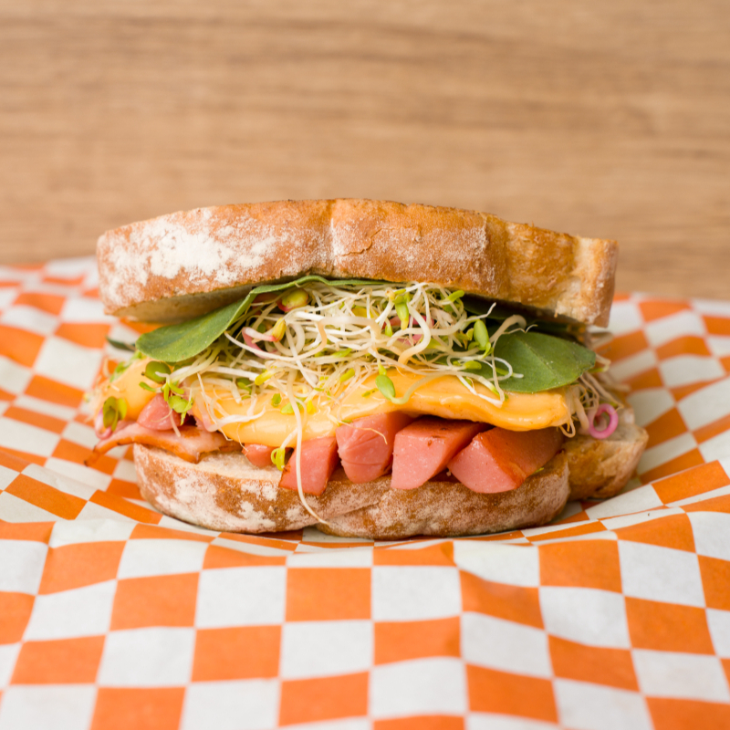Pan artesanal relleno de jamón, salchicha, tocino crujiente y una variedad de quesos derretidos. Servido con arúgula y espinaca frescas para el balance perfecto. Sencillo, completo y ¡absolutamente delicioso!