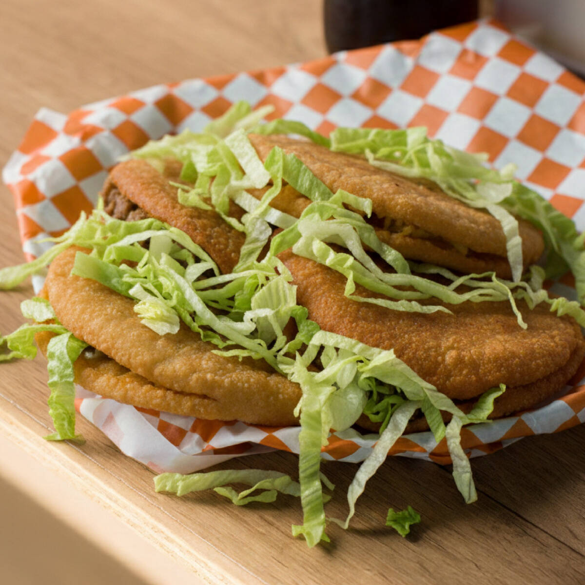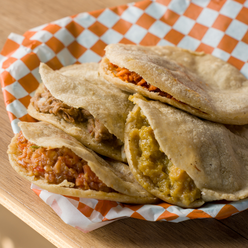 4 gorditas de maíz doraditas al punto, rellenas de tus guisos favoritos. Servidas con verdura fresca (lechuga y tomate) y salsa de la casa. ¡Crujientes por fuera, suaves por dentro!