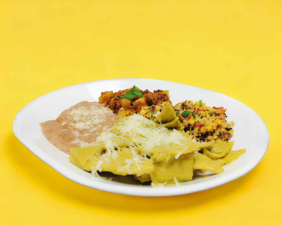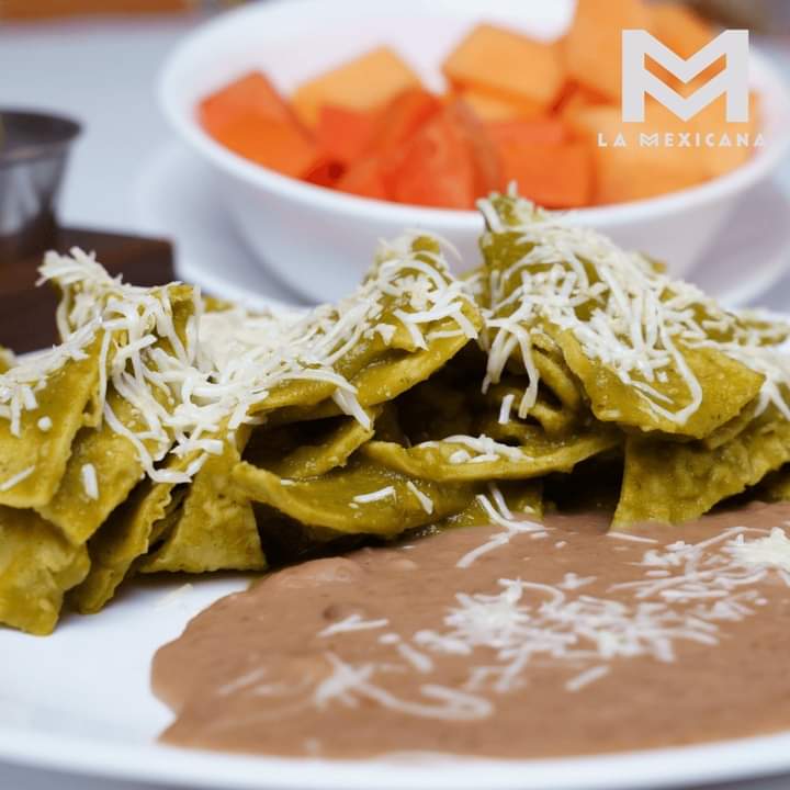 Chilaquiles en salsa verde y crema, acompañados de frijoles