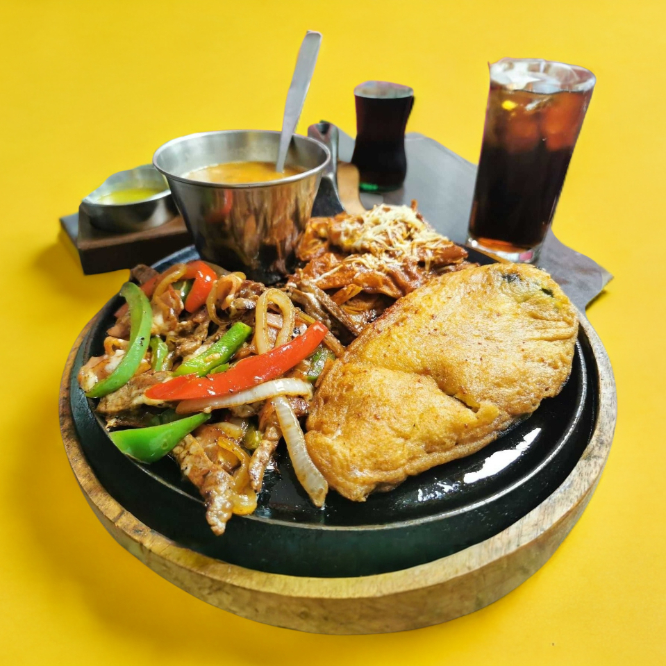 Fajitas de res, cebolla, morrón verde y rojo, acompañadas de frijoles charros.