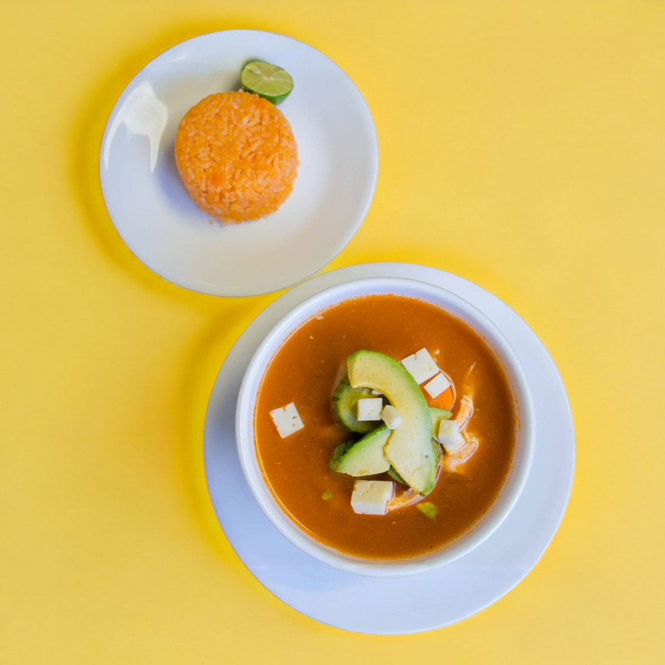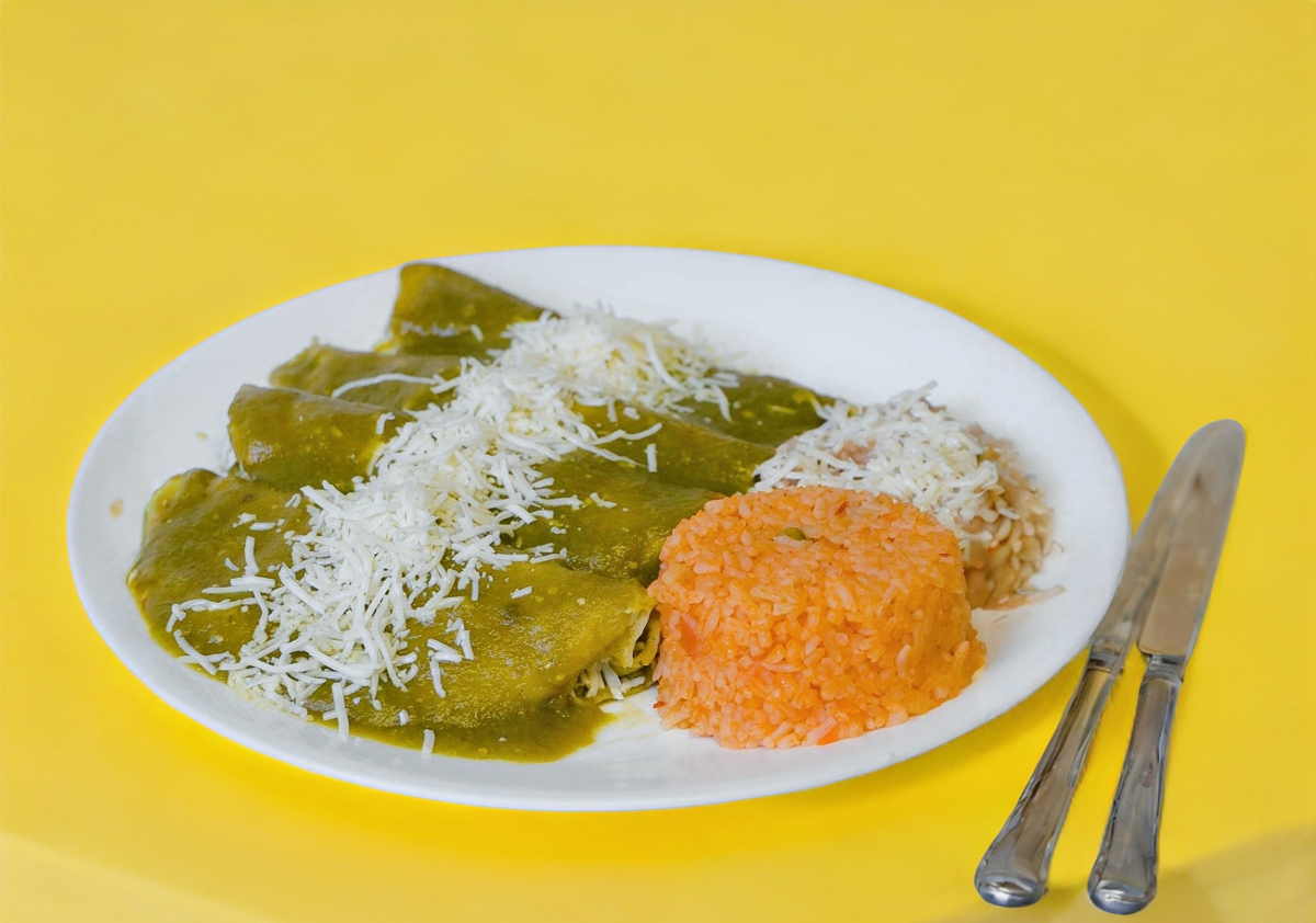 Salsa y crema verde, acompañado de arroz y frijoles.
