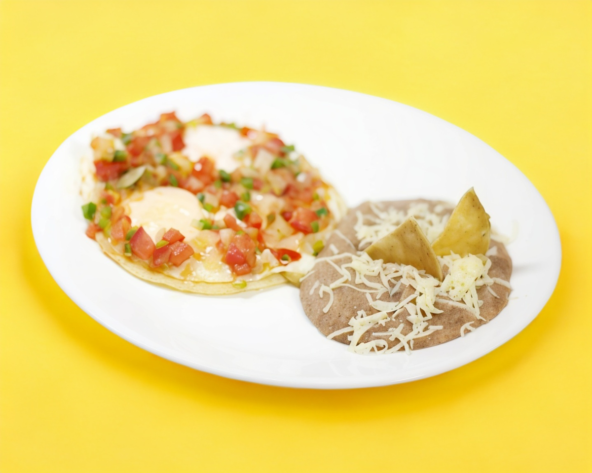 Huevo estrellado bañado en salsa ranchera, chilaquiles rojos deshebrada y frijoles refritos.